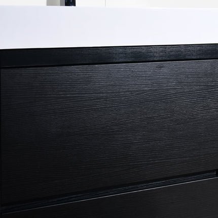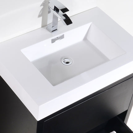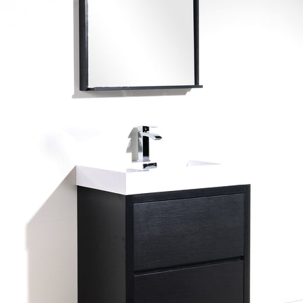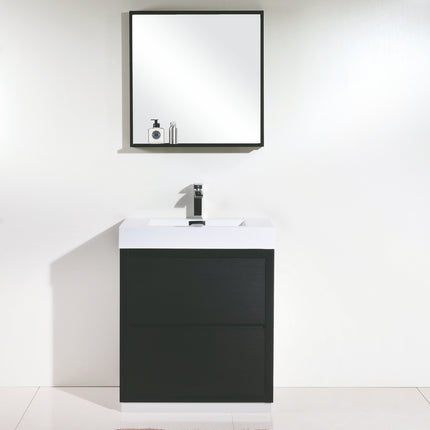 Kube Bath Bliss 30″ Black Free Standing Modern Bathroom Vanity The Bliss is one of the most elegant modern Bathroom Vanities around. This 30 Inch model comes with a reinforced Acrylic sink, Marine Veneer Constructed Console that is fully moister and water proof, with high quality European DTC Hardware, that provides smooth push-open operation drawers.