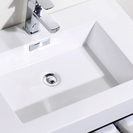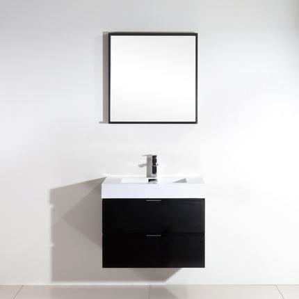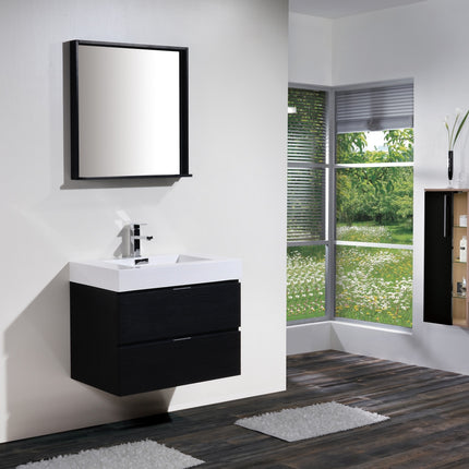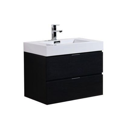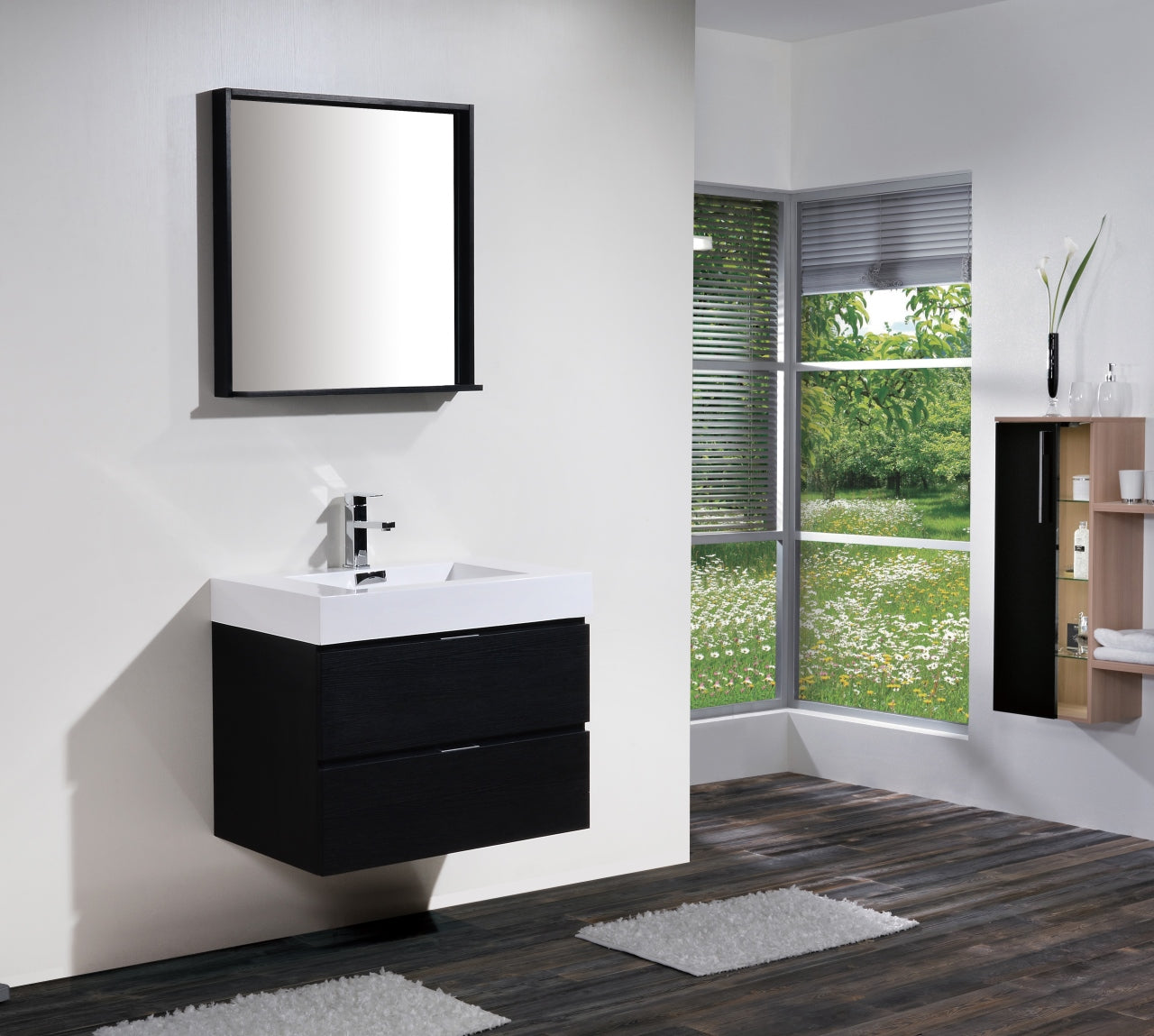 Kube Bath Bliss 30″ Black Wall Mount Modern Bathroom Vanity The Bliss is one of the most elegant modern Bathroom Vanities around. This 30 Inch model comes with a reinforced Acrylic sink, Marine Wood Veneer Constructed Console that is fully moister and water proof, with high quality European DTC Hardware, that provides smooth soft-closing operation drawers.