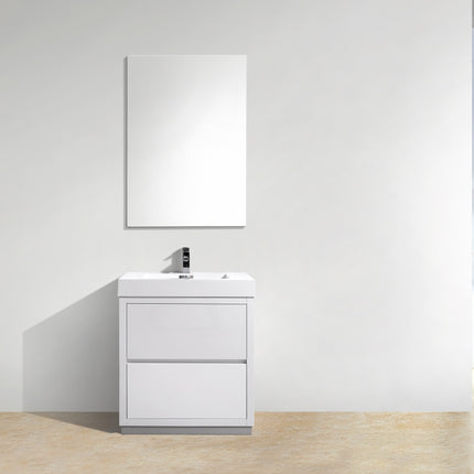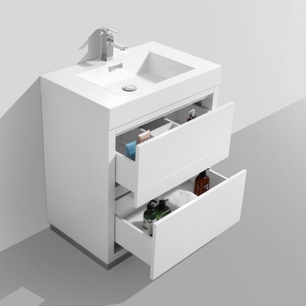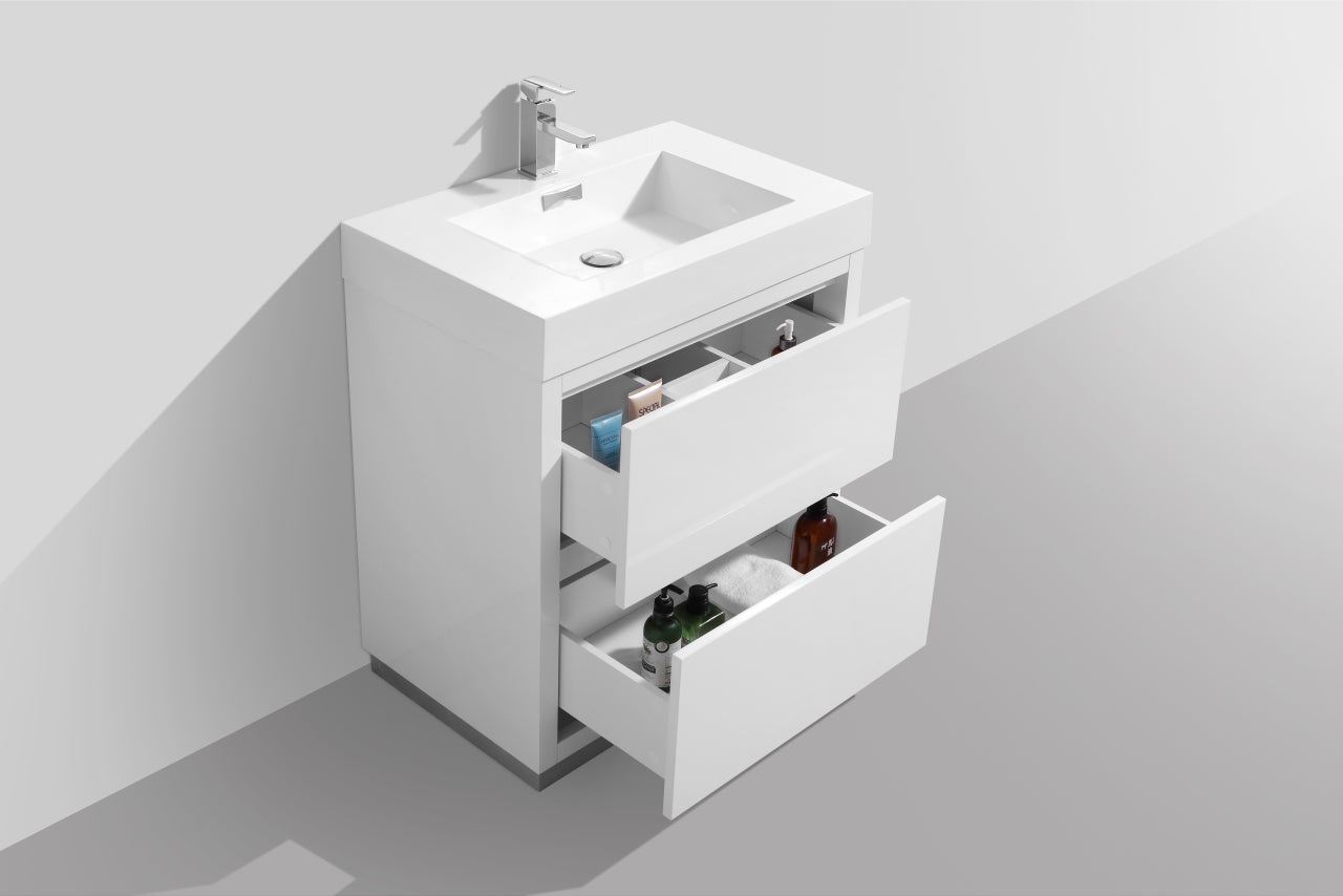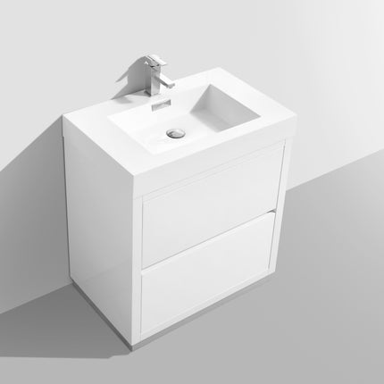 Kube Bath Bliss 30″ High Gloss White Free Standing Modern Bathroom Vanity The Bliss is one of the most elegant modern Bathroom Vanities around. This 30 Inch model comes with a reinforced Acrylic sink, MDF Wood Constructed Console that is fully moister and water proof, with high quality European DTC Hardware, that provides smooth push-open operation drawers.