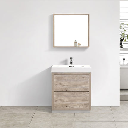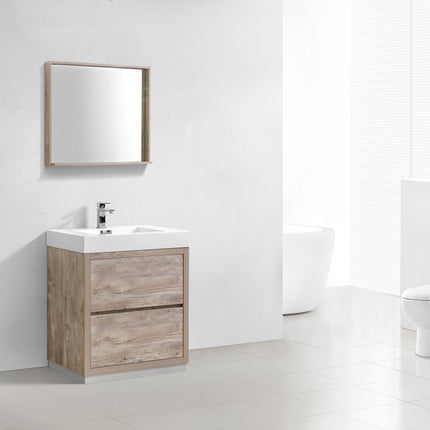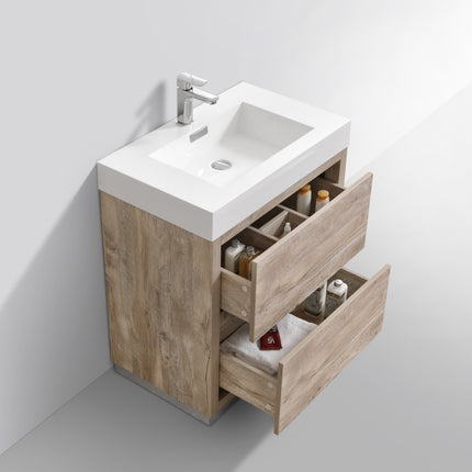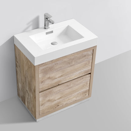 Kube Bath Bliss 30″ Nature Wood Floor Mount Modern Bathroom Vanity The Bliss is one of the most elegant modern Bathroom Vanities around. This 30 Inch model comes with a reinforced Acrylic sink, Marine Wood Veneer Constructed Console with high quality European Hardware, that provides smooth push-open operation drawers.