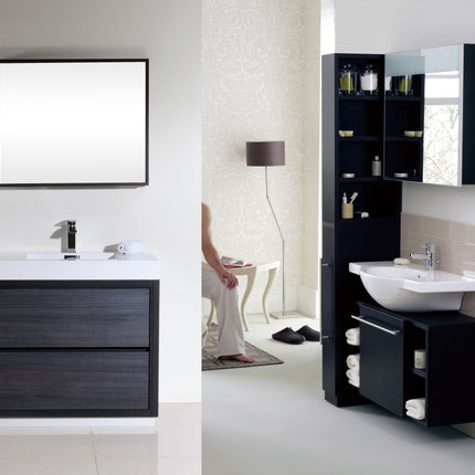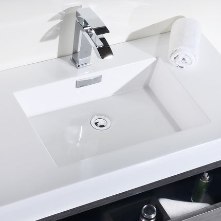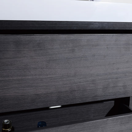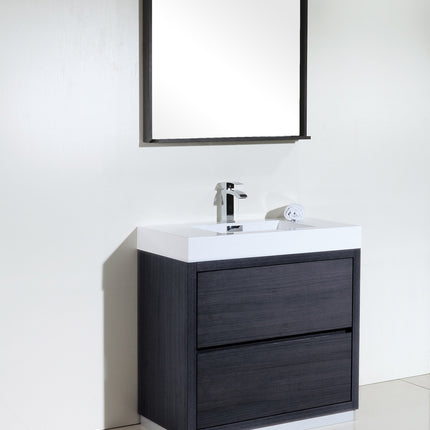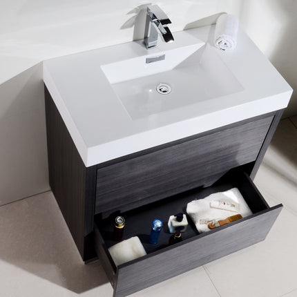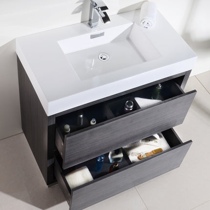 Kube Bath Bliss 36″ Gray Oak Free Standing Modern Bathroom Vanity The Bliss is one of the most elegant modern Bathroom Vanities around. This 36 Inch model comes with a reinforced Acrylic sink, Marine Wood Veneer Constructed Console that is fully moister and water proof, with high quality European DTC Hardware, that provides smooth push-open operation drawers.