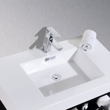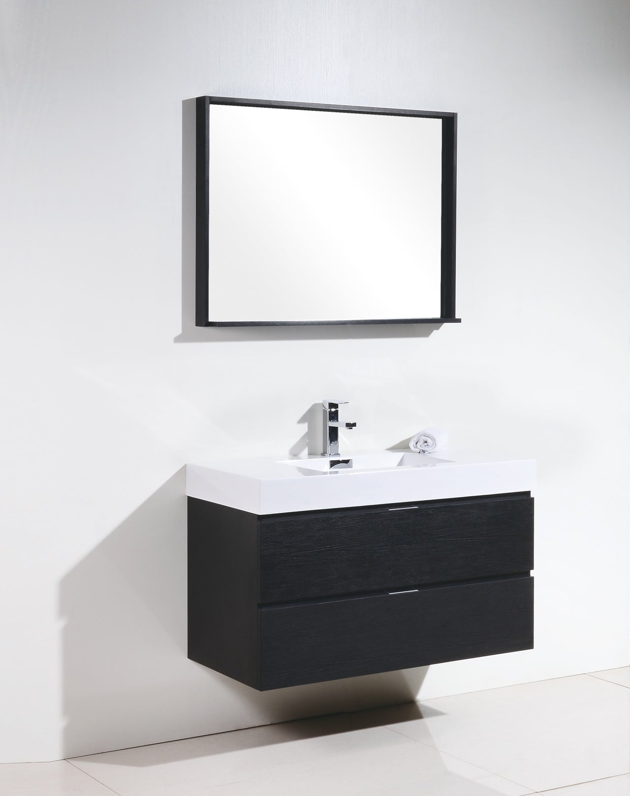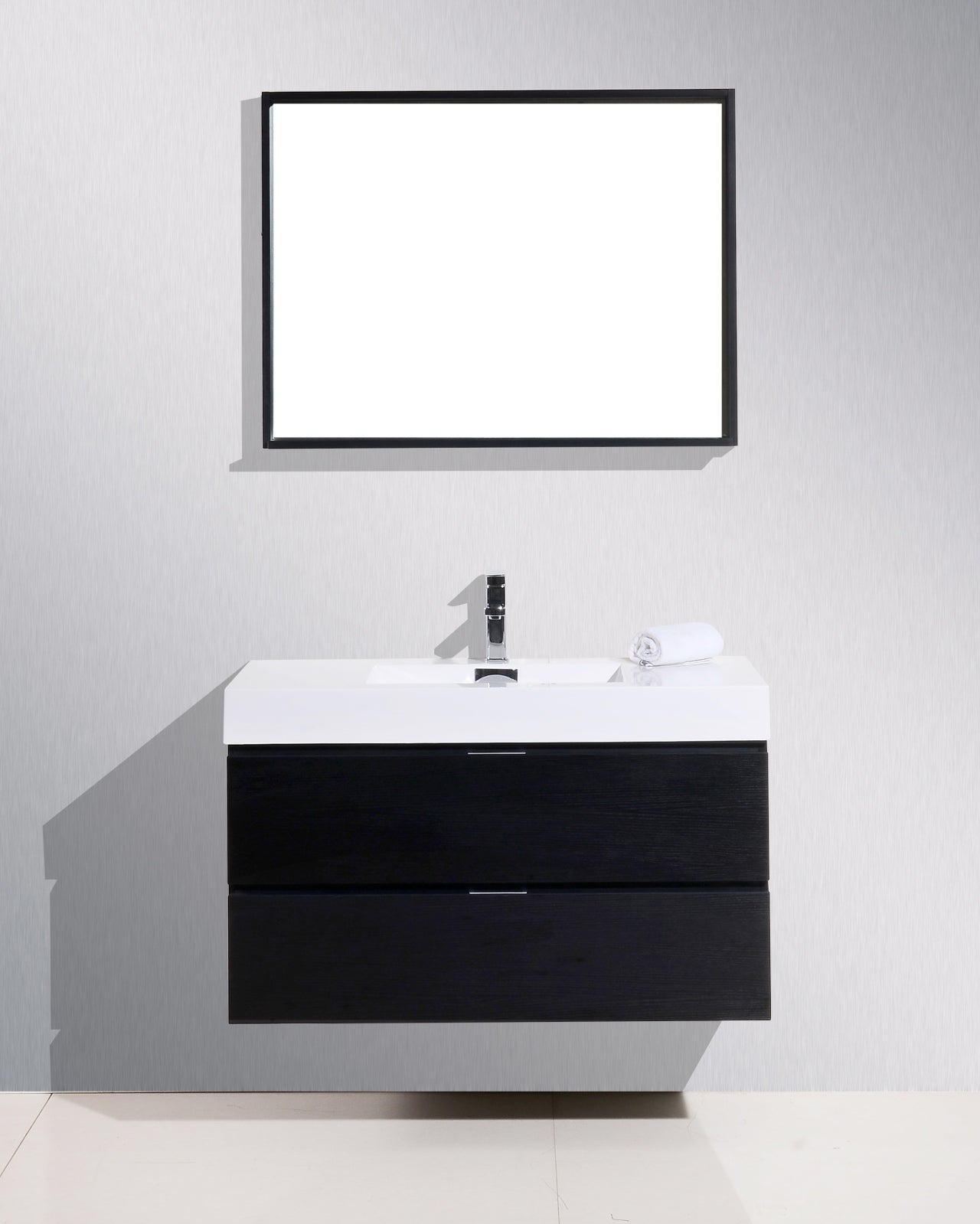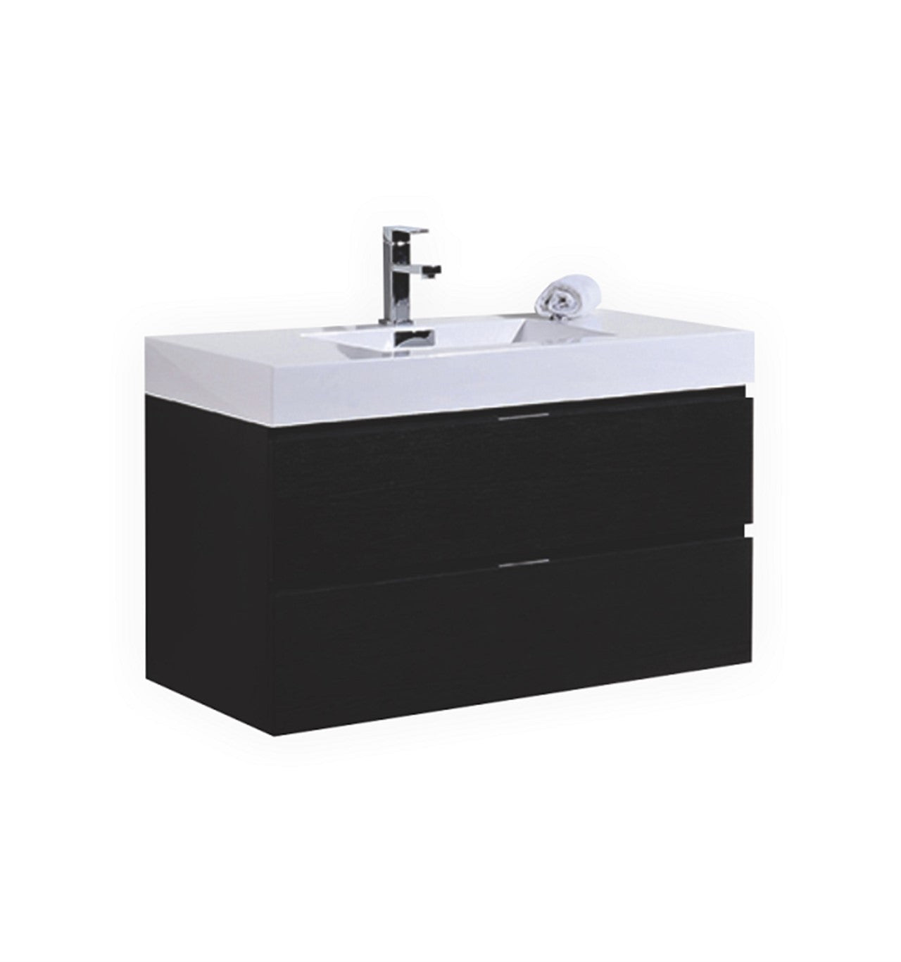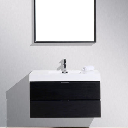 Kube Bath Bliss 40″ Black Wood Wall Mount Modern Bathroom Vanity The Bliss is one of the most elegant modern Bathroom Vanities around. This 40 Inch model comes with a reinforced Acrylic sink, Marine Wood Veneer Constructed Console that is fully moister and water proof, with high quality European DTC Hardware, that provides smooth soft-closing operation drawers.