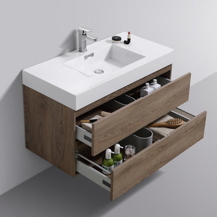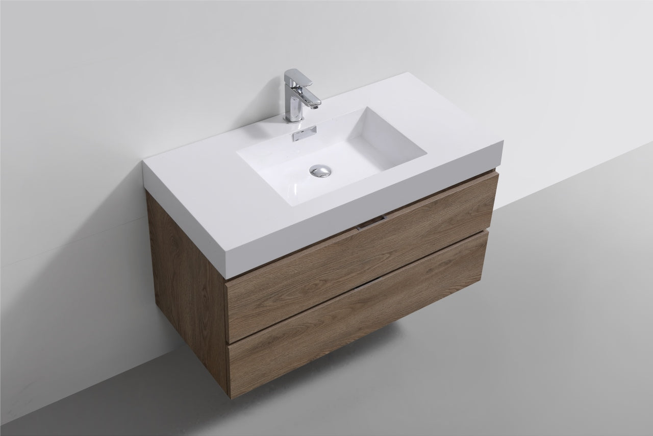 Kube Bath Bliss 40″ Butternut Wall Mount Modern Bathroom Vanity The Bliss is one of the most elegant modern Bathroom Vanities around. This 40 inch model comes with a reinforced Acrylic sink, Marine Wood Veneer Constructed Console that is fully moister and waterproof, with high-quality European DTC Hardware, that provides smooth soft-closing operation drawers.