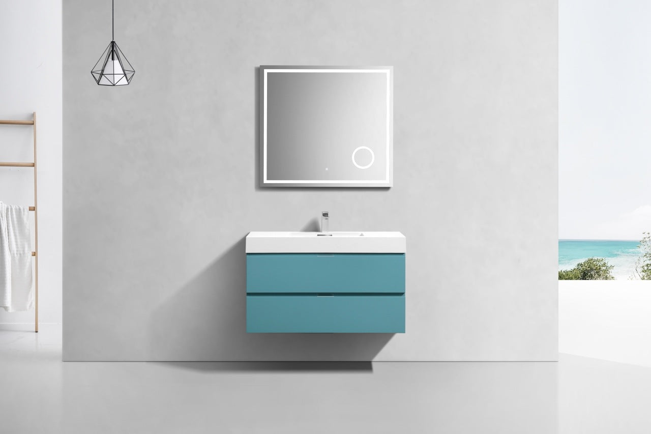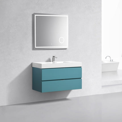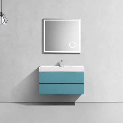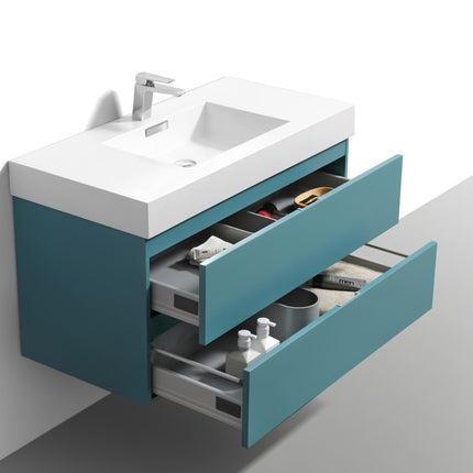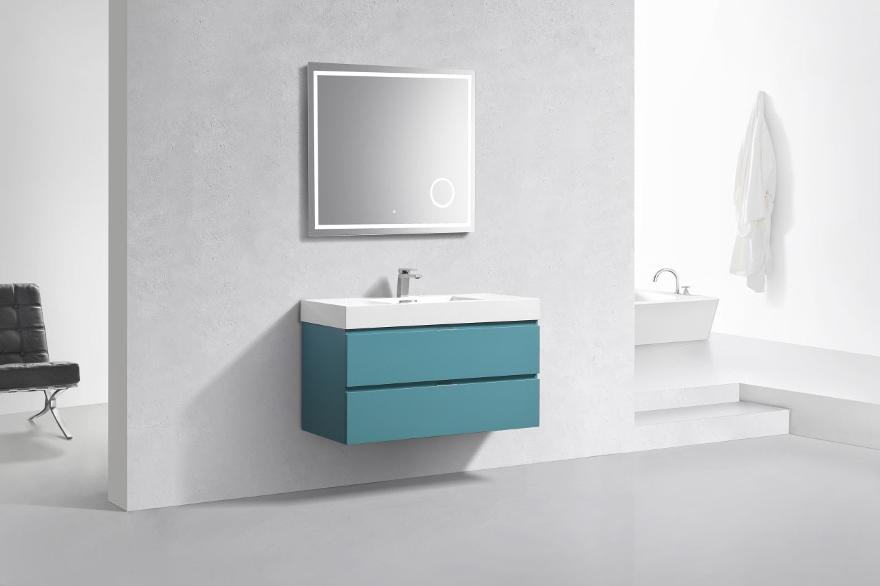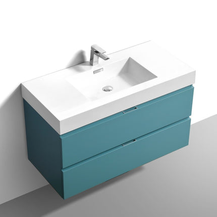 Kube Bath Bliss 40″ Teal Green Wall Mount Modern Bathroom Vanity The Bliss is one of the most elegant modern Bathroom Vanities around. This 40 inch model comes with a reinforced Acrylic sink, MDF Wood Constructed Console that is fully moister and waterproof, with high-quality European DTC Hardware, that provides smooth soft-closing operation drawers.