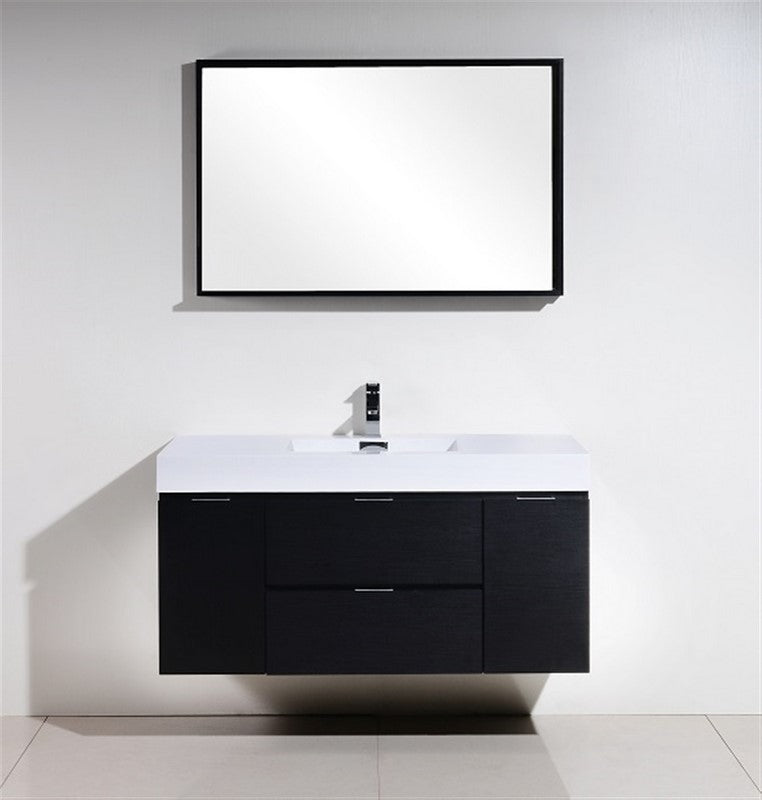 Kube Bath Bliss 48″ Black Wall Mount Single Sink Modern Bathroom Vanity The Bliss is one of the most elegant modern Bathroom Vanities around. This 48 Inch model comes with a reinforced Acrylic sink, Marine Wood Veneer Constructed Console that is fully moister and water proof, with high quality European DTC Hardware, that provides smooth soft-closing operation drawers.