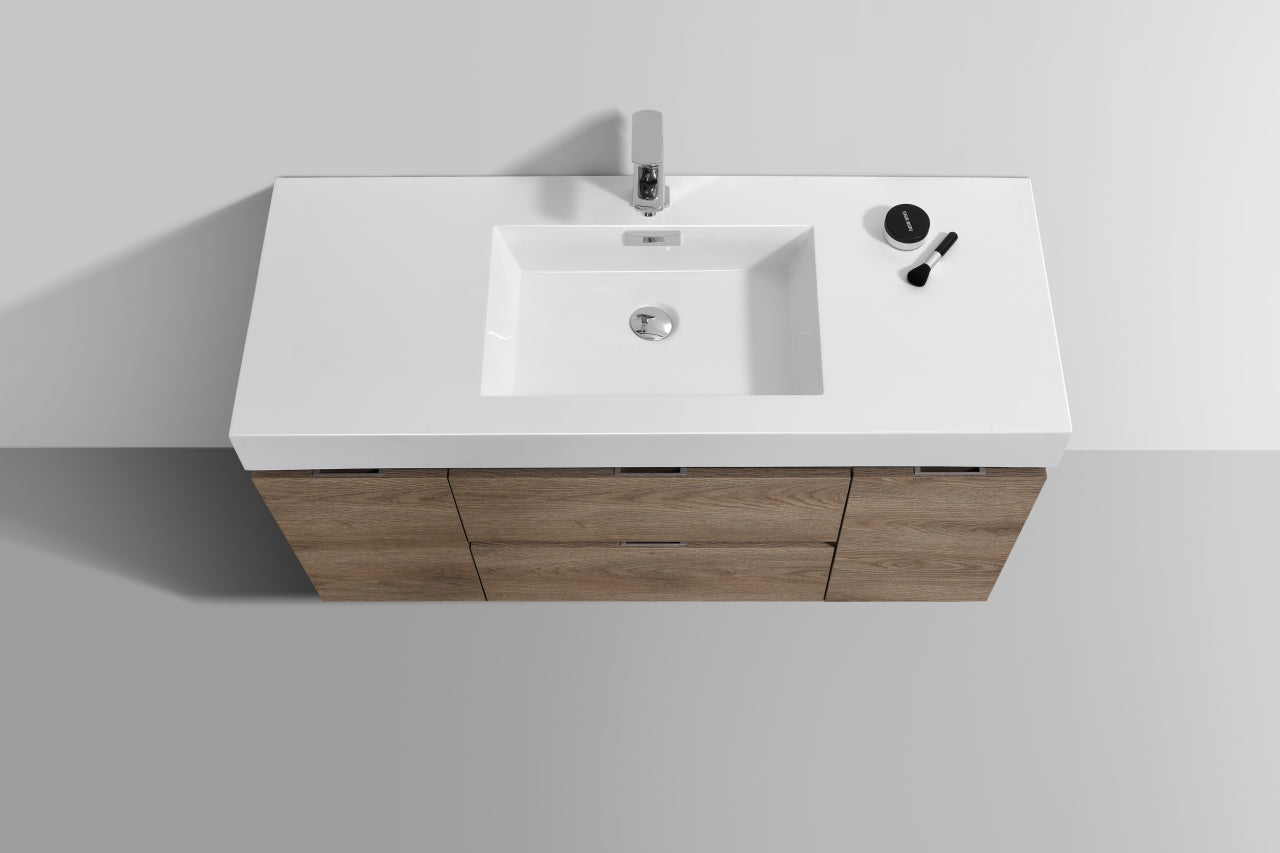 Kube Bath Bliss 48″ Butternut Wall Mount Single Sink Modern Bathroom Vanity The Bliss is one of the most elegant modern Bathroom Vanities around. This 48 inch model comes with a reinforced Acrylic sink, Marine Wood Veneer Constructed Console that is fully moister and waterproof, with high-quality European DTC Hardware, that provides smooth soft-closing operation drawers.