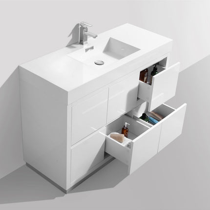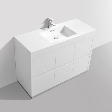 Kube Bath Bliss 48″ High Gloss White Free Standing Modern Bathroom Vanity The Bliss is one of the most elegant modern Bathroom Vanities around. This 48 Inch model comes with a reinforced Acrylic sink, MDF Wood Constructed Console, with high quality European DTC Hardware, that provides smooth push-open operation drawers.