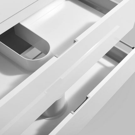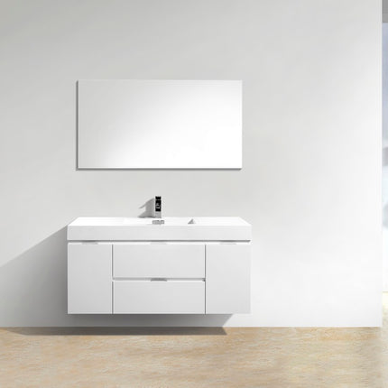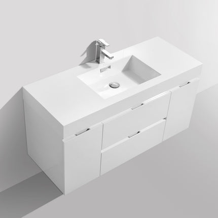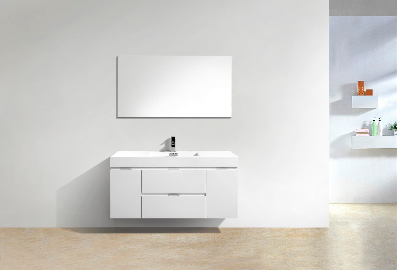 Kube Bath Bliss 48″ High Gloss White Wall Mount Modern Bathroom Vanity The Bliss is one of the most elegant modern Bathroom Vanities around. This 48 Inch model comes with a reinforced Acrylic sink, MDF Wood Constructed Console that is fully moister and water proof, with high quality European DTC Hardware, that provides smooth soft-closing operation drawers.