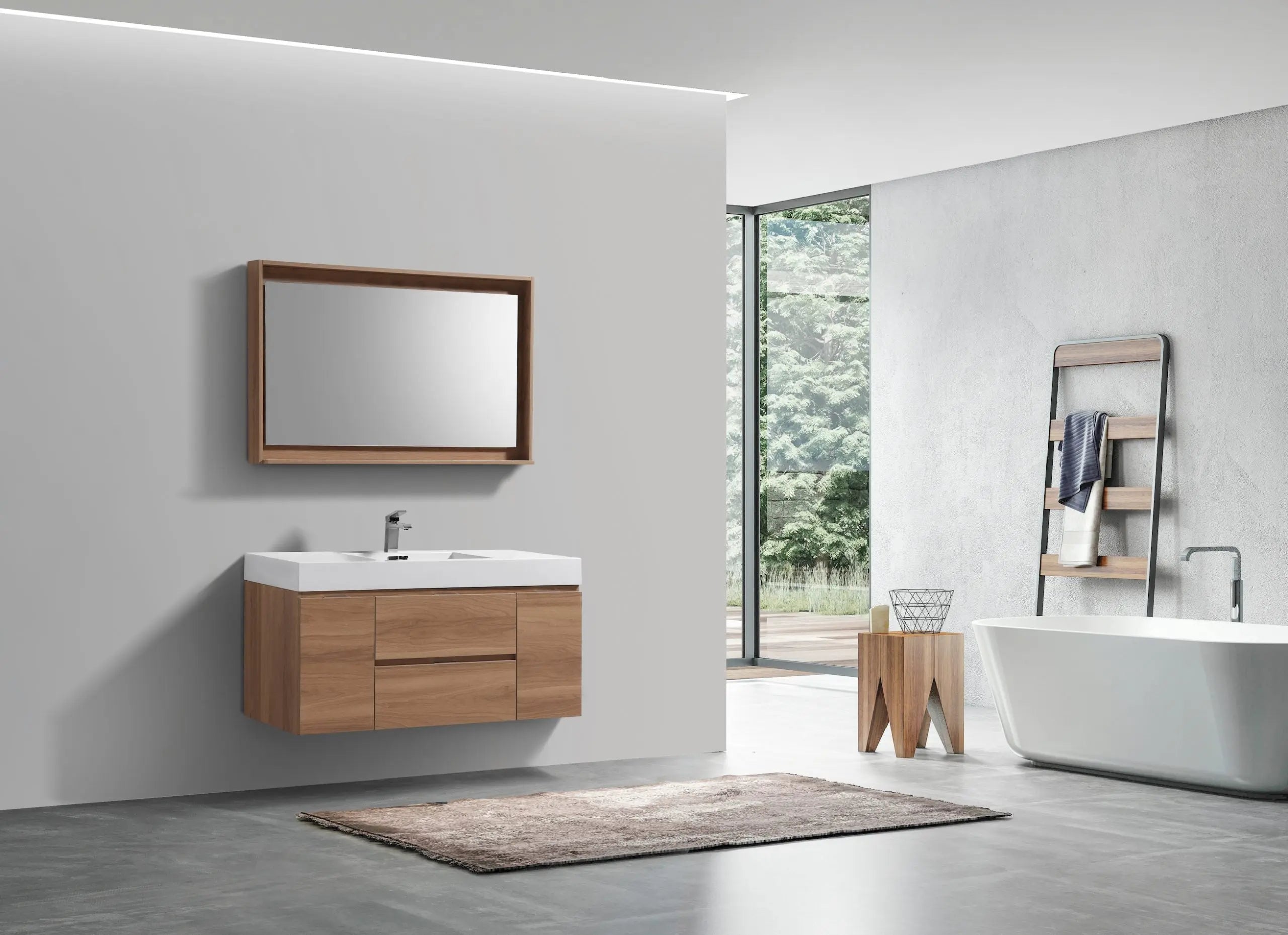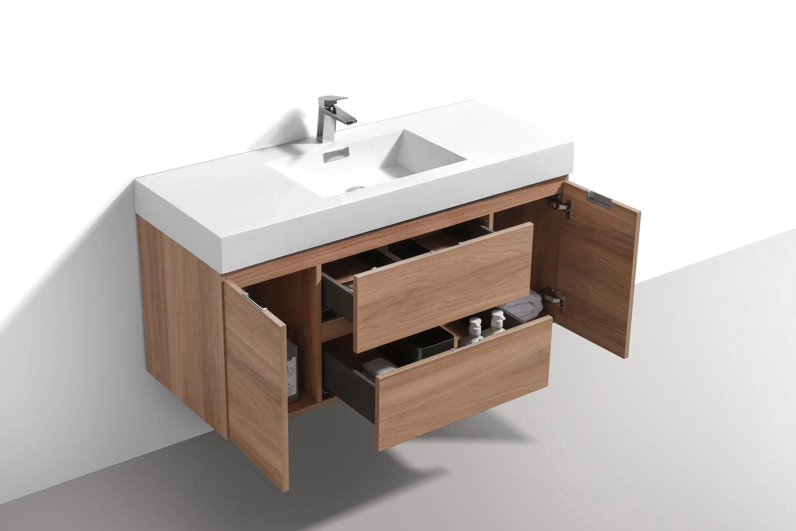 The Bliss is one of the most elegant modern Bathroom Vanities around. This 48 Inch model comes with a reinforced Acrylic sink, Marine Wood Veneer Constructed Console that is fully moister and water proof, with high quality European DTC Hardware, that provides smooth soft-closing operation drawers.