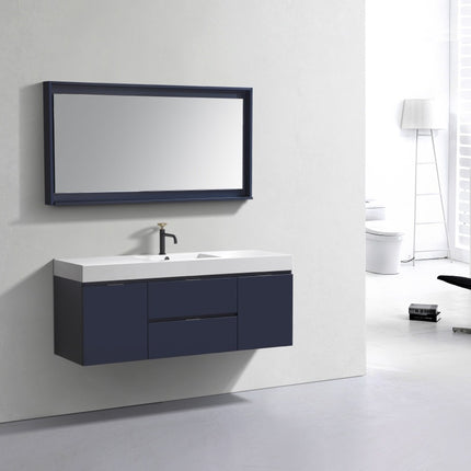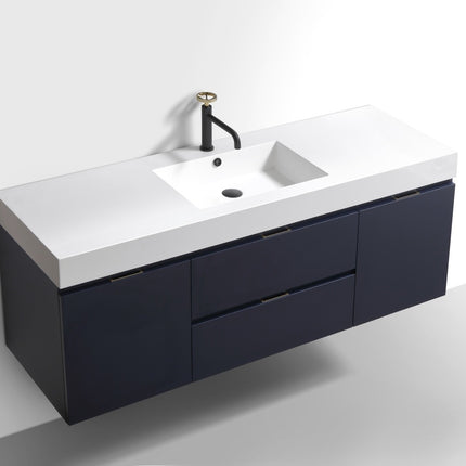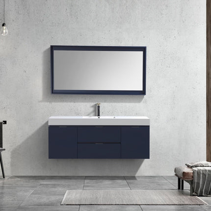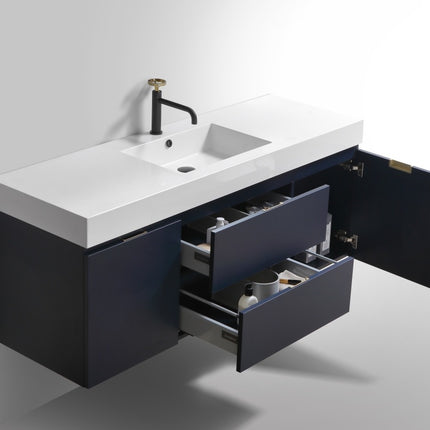 Kube Bath Bliss 60″ Blue Wall Mount Single Sink Modern Bathroom Vanity The Bliss is one of the most elegant modern Bathroom Vanities around. This 60 inch model comes with a reinforced Acrylic sink, Wood Veneer Constructed Console that is fully moister and waterproof, with high-quality European DTC Hardware, that provides smooth soft-closing operation drawers.