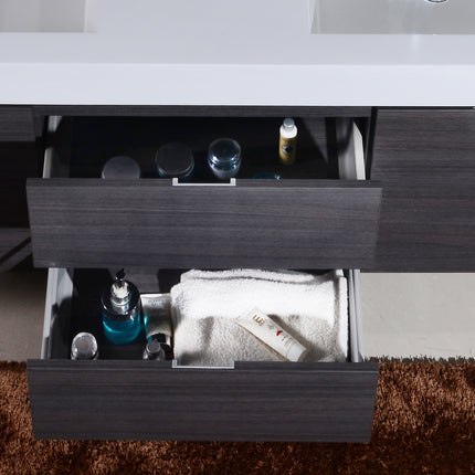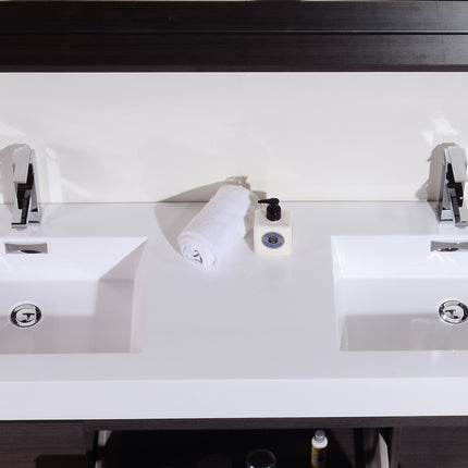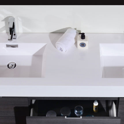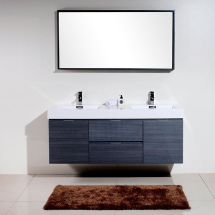 Kube Bath Bliss 60″ Gray Oak Wall Mount Double Sink Modern Bathroom Vanity The Bliss is one of the most elegant modern Bathroom Vanities around. This 60 Inch model comes with a reinforced Acrylic sink, Marine Veneer Constructed Console that is fully moister and water proof, with high quality European DTC Hardware, that provides smooth soft-closing operation drawers.