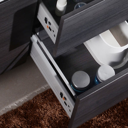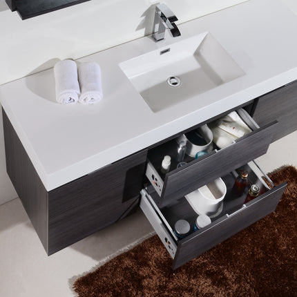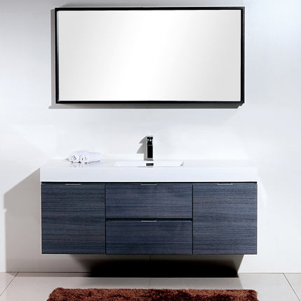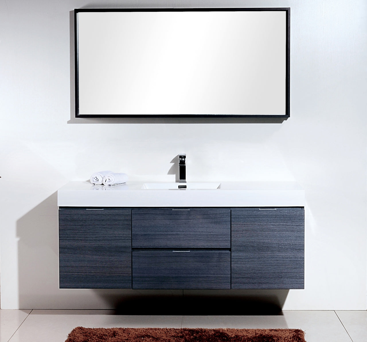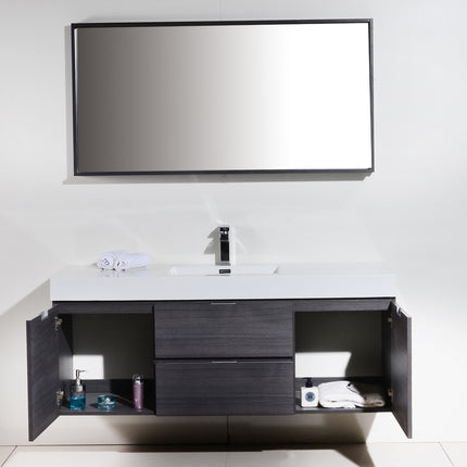 Kube Bath Bliss 60″ Gray Oak Wall Mount Single Sink Modern Bathroom Vanity The Bliss is one of the most elegant modern Bathroom Vanities around. This 60 Inch model comes with a reinforced Acrylic sink, Marine Wood Veneer Constructed Console that is fully moister and water proof, with high quality European DTC Hardware, that provides smooth soft-closing operation drawers.