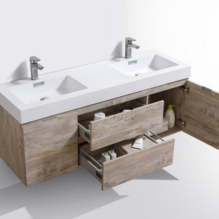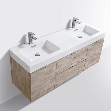 Kube Bath Bliss 60″ Nature Wood Wall Mount Double Sink Modern Bathroom Vanity The Bliss is one of the most elegant modern Bathroom Vanities around. This 60 Inch model comes with a reinforced Acrylic sink, Marine Wood Veneer Constructed Console that is fully moister and water proof, with high quality European Hardware, that provides smooth soft-closing operation drawers.
