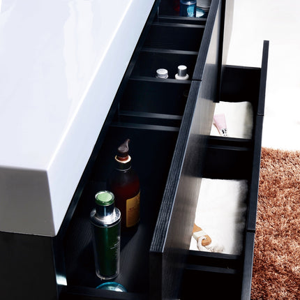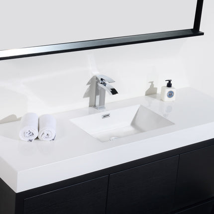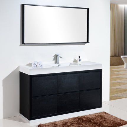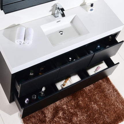 Kube Bath Bliss 60″ Single Sink Black Free Standing Modern Bathroom Vanity The Bliss is one of the most elegant modern Bathroom Vanities around. This 60 Inch model comes with a reinforced Acrylic sink, Marine Wood Veneer Constructed Console that is fully moister and water proof, with high quality European Hardware, that provides smooth push-open operation drawers.