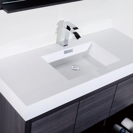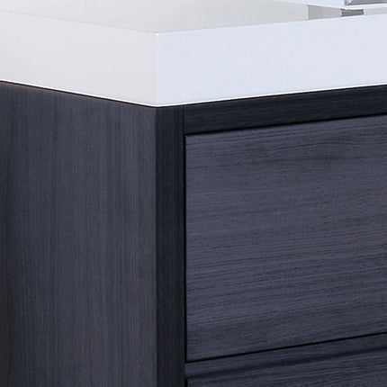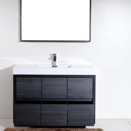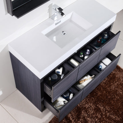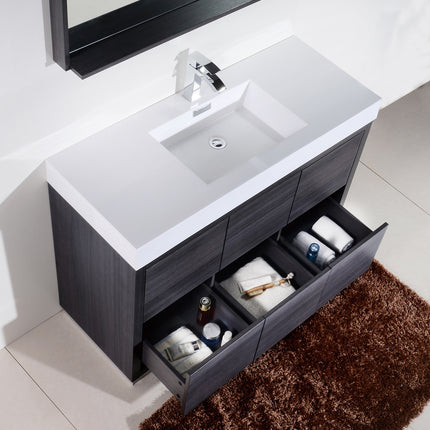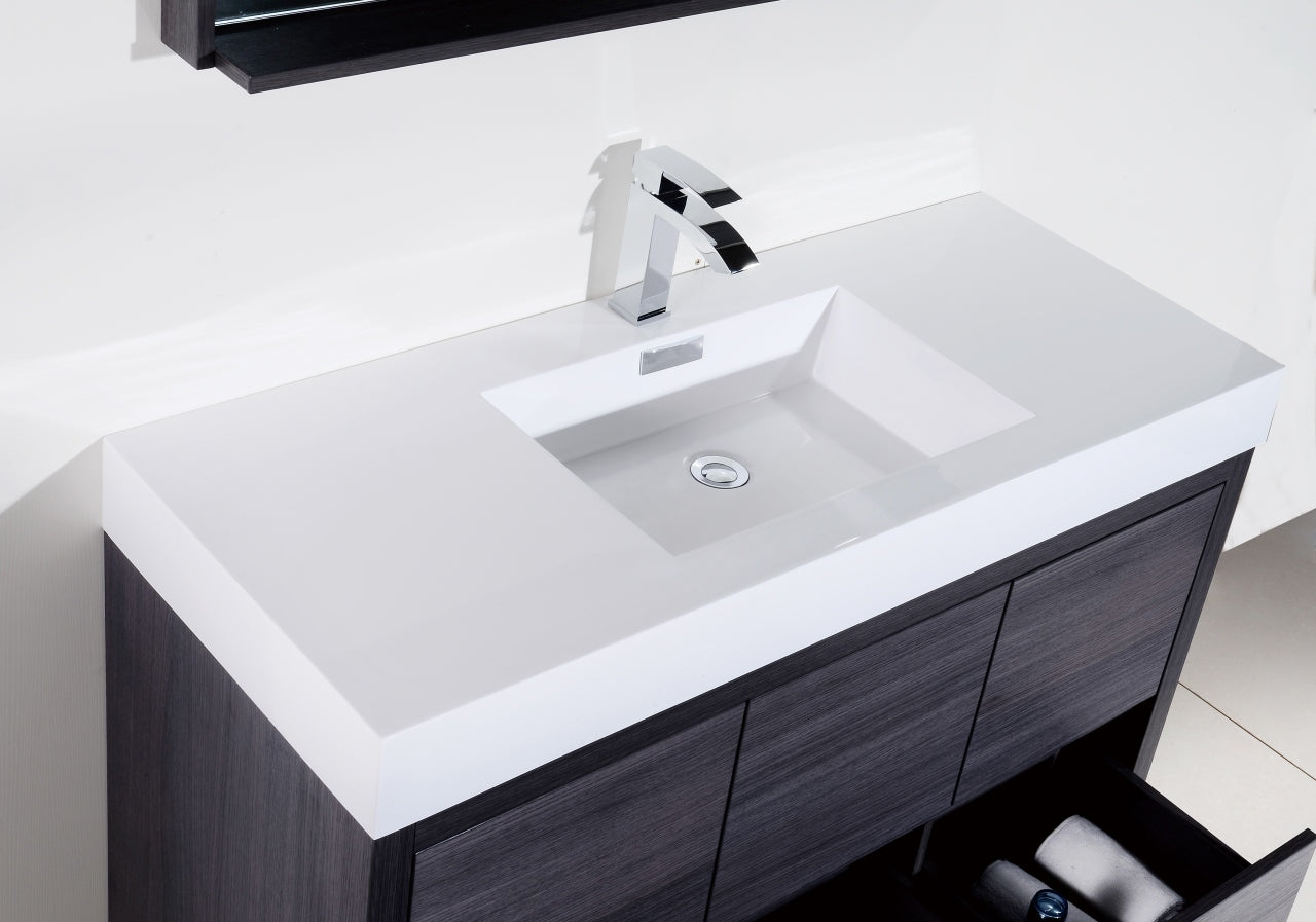 Kube Bath Bliss 60″ Single Sink Gray Oak Free Standing Modern Bathroom Vanity The Bliss is one of the most elegant modern Bathroom Vanities around. This 60 Inch model comes with a reinforced Acrylic sink, Marine Wood Veneer Constructed Console that is fully moister and water proof, with high quality European Hardware, that provides smooth push-open operation drawers.