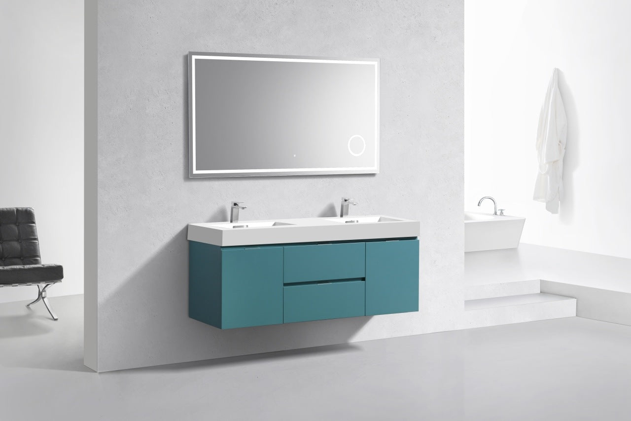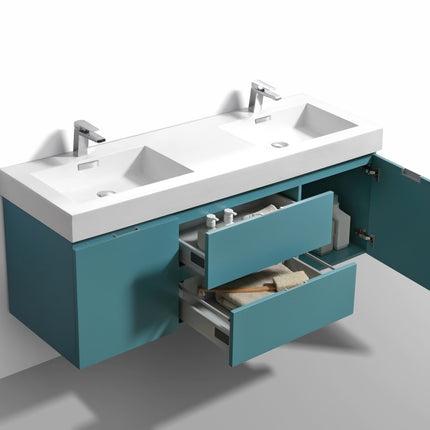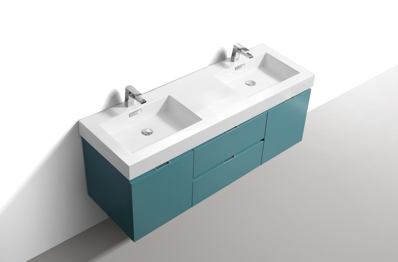 Kube Bath Bliss 60″ Turquoise Green Wall Mount Double Sink Modern Bathroom Vanity The Bliss is one of the most elegant modern Bathroom Vanities around. This 60 inch model comes with a reinforced Acrylic sink, MDF Wood Constructed Console that is fully moister and waterproof, with high-quality European DTC Hardware, that provides smooth soft-closing operation drawers.