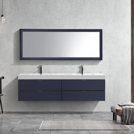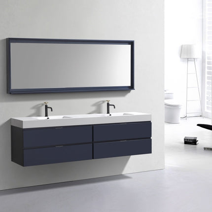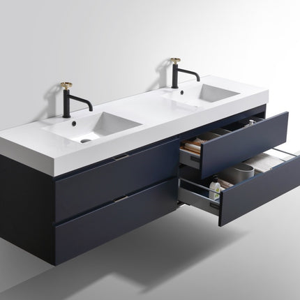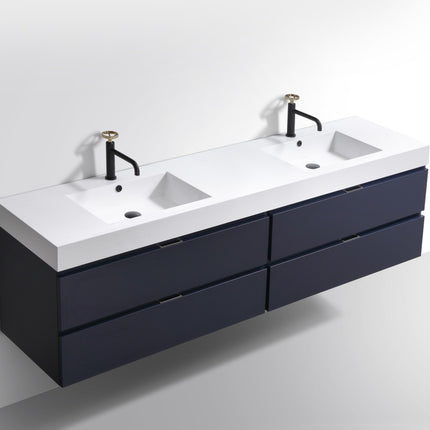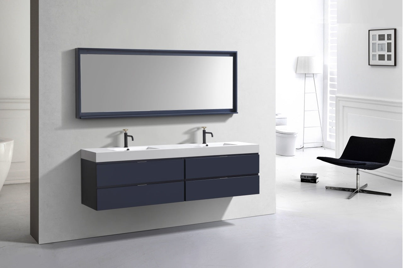 Kube Bath Bliss 72″ Blue Wall Mount Double Sink Modern Bathroom Vanity The Bliss is one of the most elegant modern Bathroom Vanities around. This 72-inch model comes with a reinforced Acrylic sink, Wood Veneer Constructed Console that is fully moisture and waterproof, with high-quality European Hardware, that provides smooth soft-closing operation drawers.