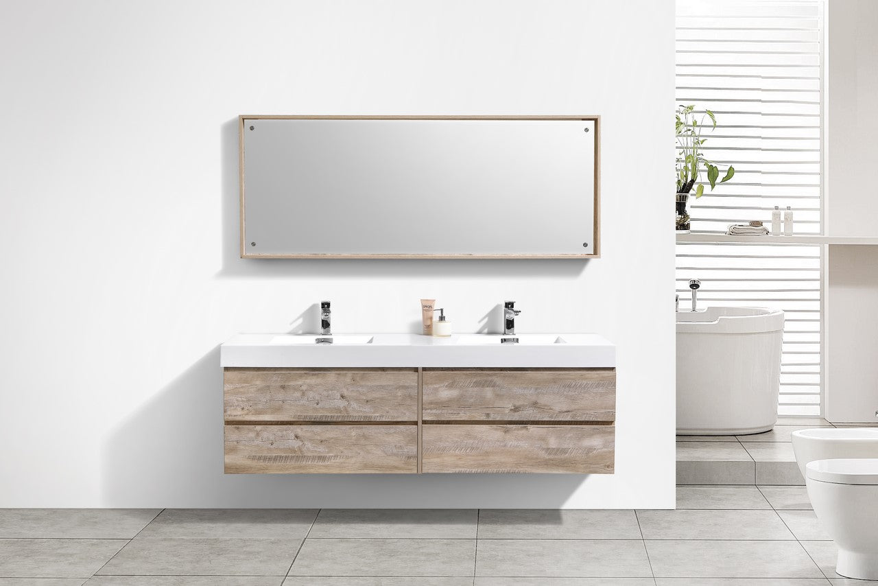 Kube Bath Bliss 72″ Nature Wood Wall Mount Double Sink Modern Bathroom Vanity The Bliss is one of the most elegant modern Bathroom Vanities around. This 72 Inch model comes with a reinforced Acrylic sink, Marine Wood Veneer Constructed Console with high quality European Hardware, that provides smooth soft-closing operation drawers.