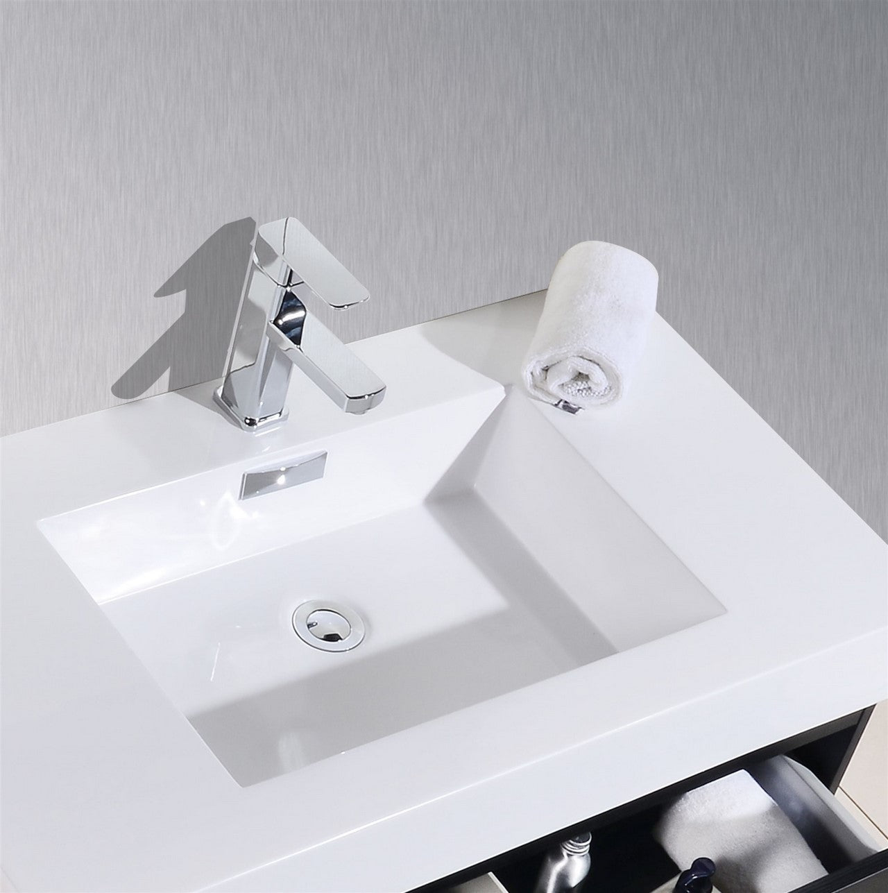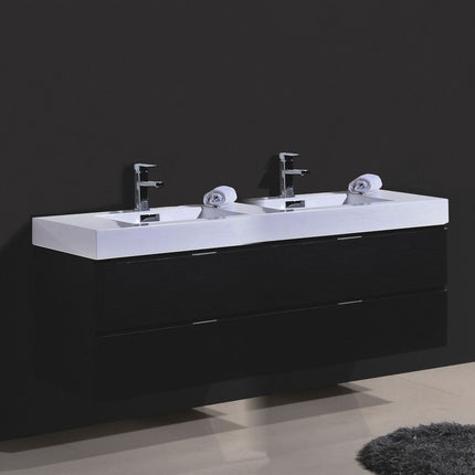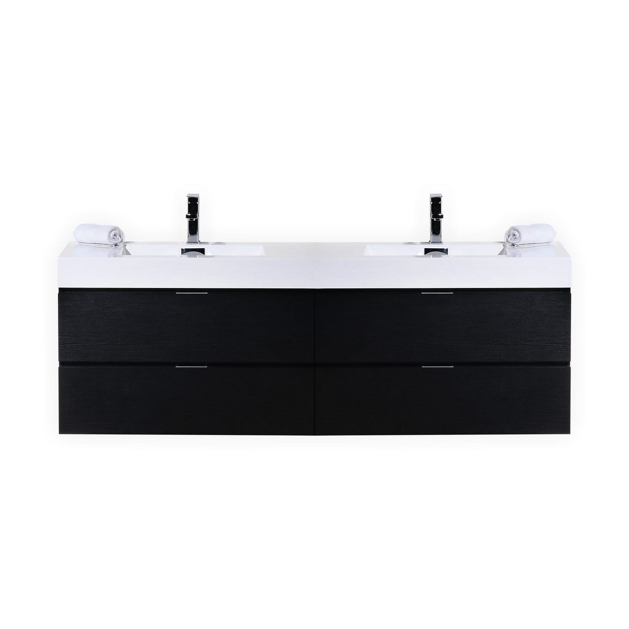 Kube Bath Bliss 80″ Black Wall Mount Double Sink Modern Bathroom Vanity The Bliss is one of the most elegant modern Bathroom Vanities around. This 80 Inch model comes with a reinforced Acrylic sink, Marine Wood Veneer Constructed Console that is fully moisture and water proof, with high quality European Hardware, that provides smooth soft-closing operation drawers.