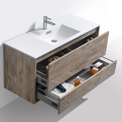 Kube Bath De Lusso 48″ Single Sink Nature Wood Wall Mount Modern Bathroom Vanity De Lusso Vanity by KubeBath is a minimalist piece you’ll cherish for years. Ingenious, this Vanity has two push-open drawers, perfect to store bathroom essentials and features a white reinforced Acrylic Countertop with integrated Sink, with crisp clean lines, pre-drilled for a single hole Faucet. An easy-to-care-for item that will add a modern touch to your Bathroom for a refreshing sleek look.