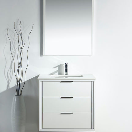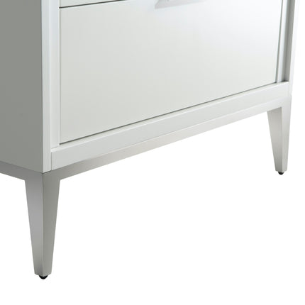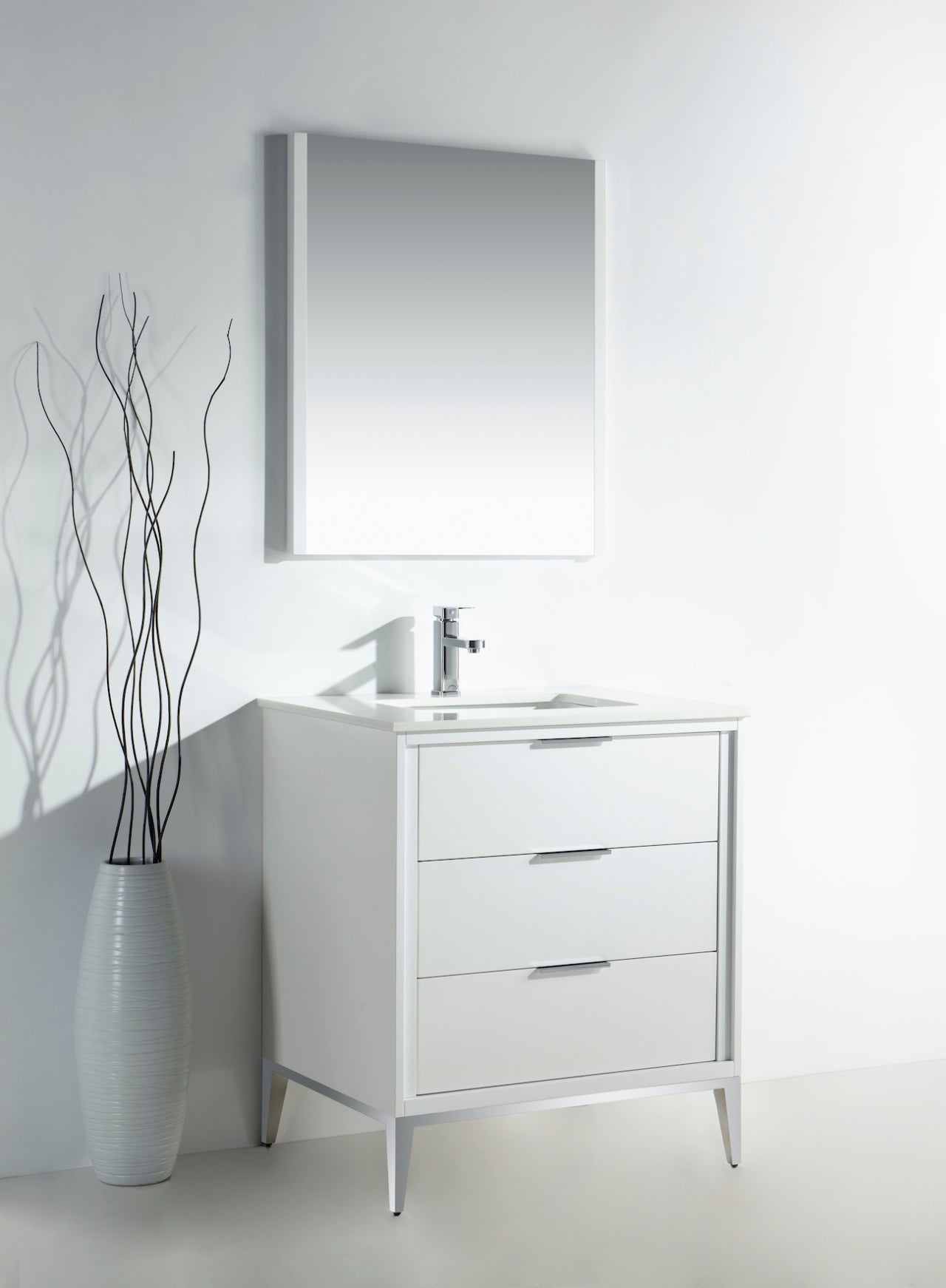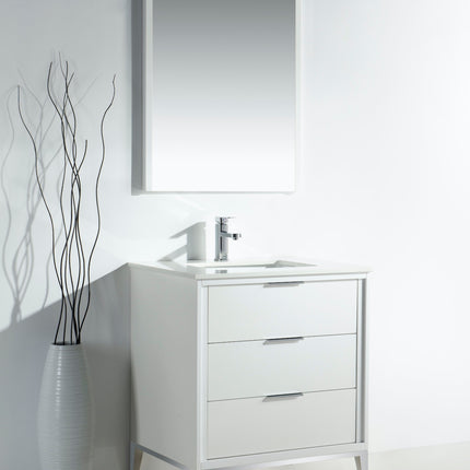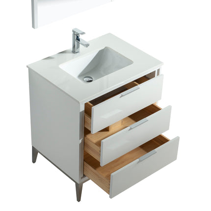 The Divani 30″ Vanity features three fully functional drawers and a pure white Quartz countertop with white Ceramic undermount Sink. The cabinet constructed in solid birch, with a rich white lacquer paint finish, while the inside of the drawers are varnished, with the natural wood color exposed.