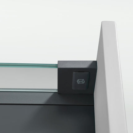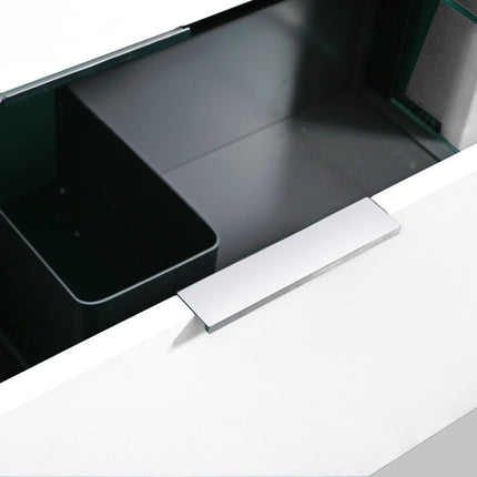 It features two fully functional, smooth glide, soft-closing metal box drawers, with glass side details.