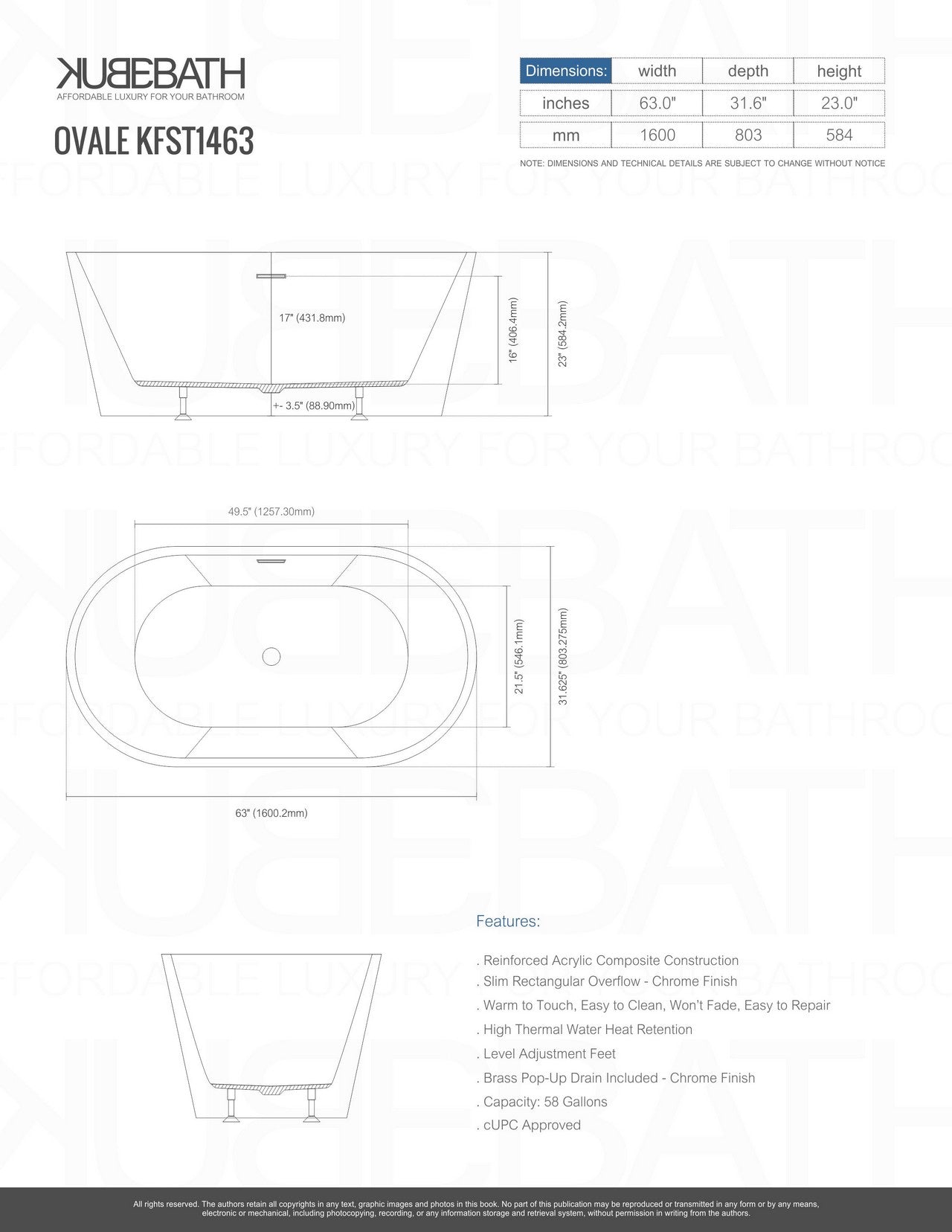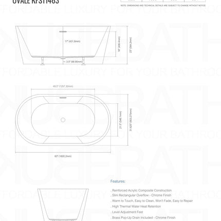 Kube Bath Ovale 63 Inch White Free Standing Bathtub