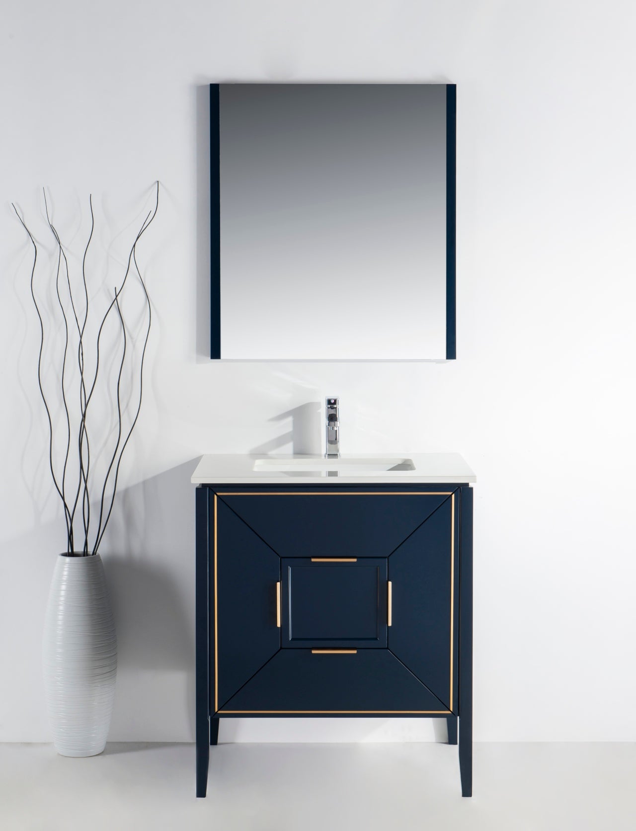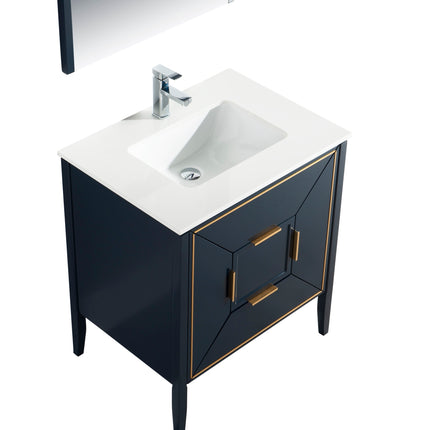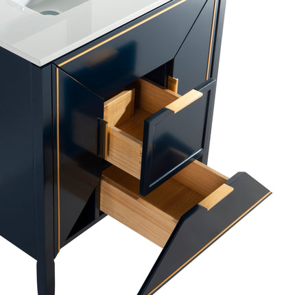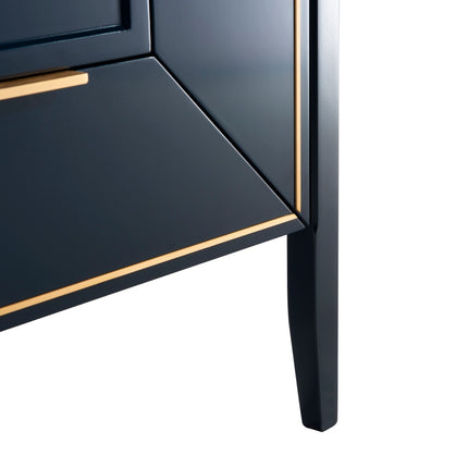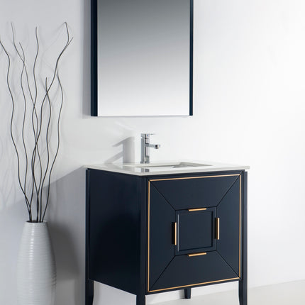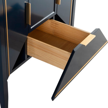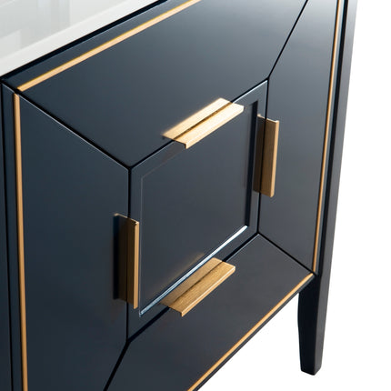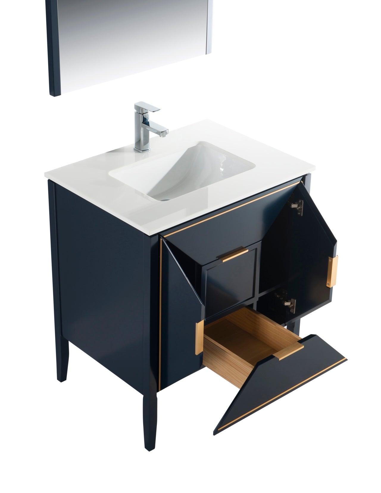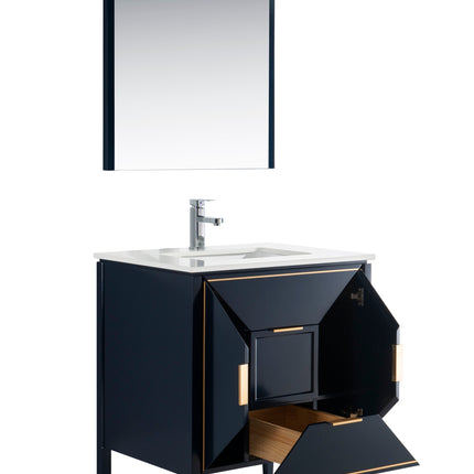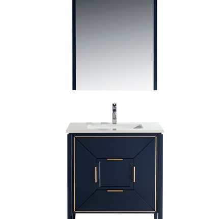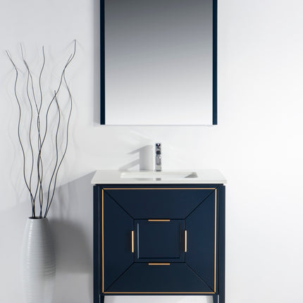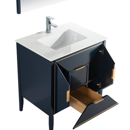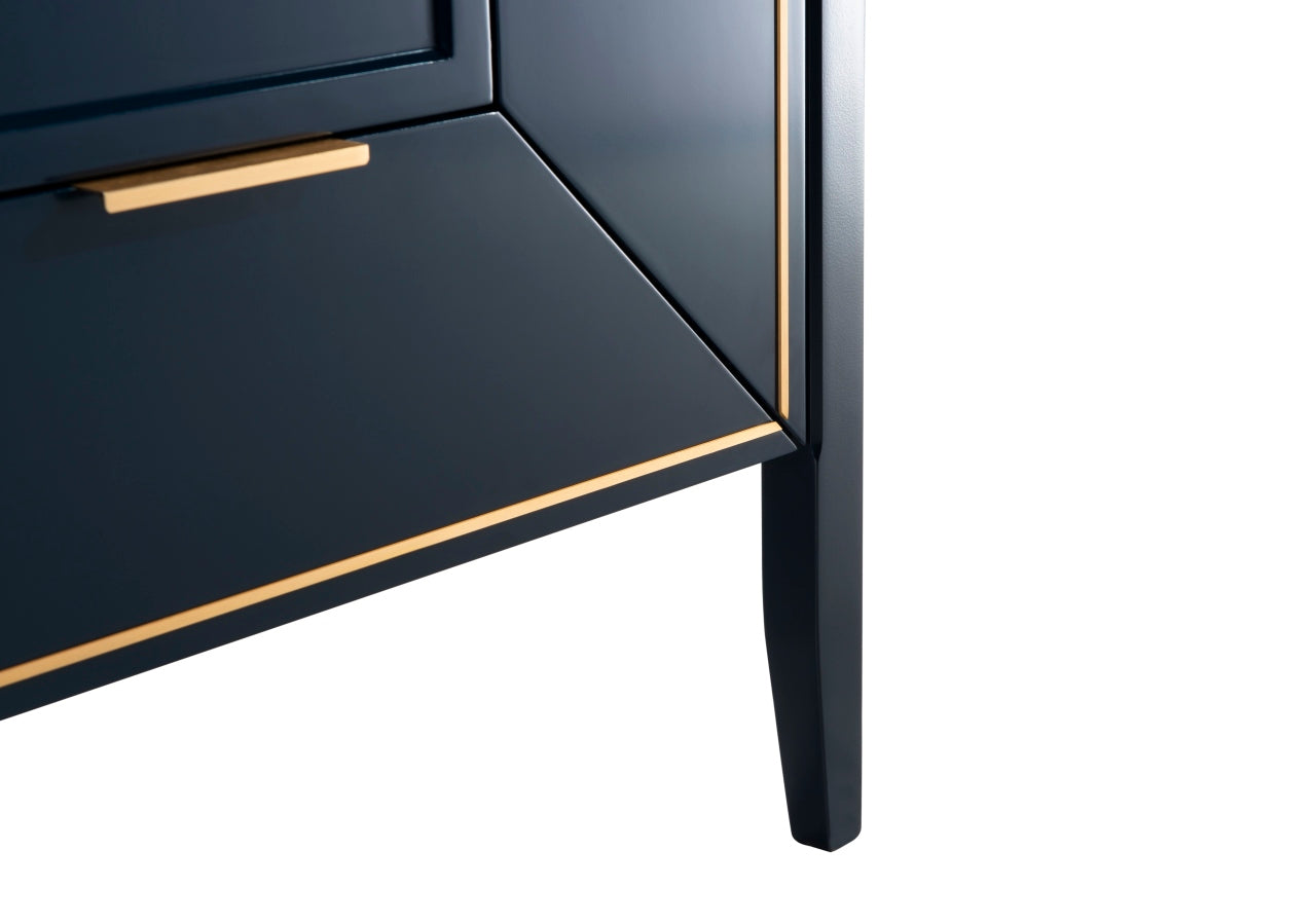 The Vetro 30″ Vanity features two fully functional drawers, two doors and a pure white Quartz countertop with white Ceramic undermount Sink. The cabinet constructed in solid birch, with a rich blue lacquer paint finish, while the inside of the drawers are varnished, with the natural wood color exposed.