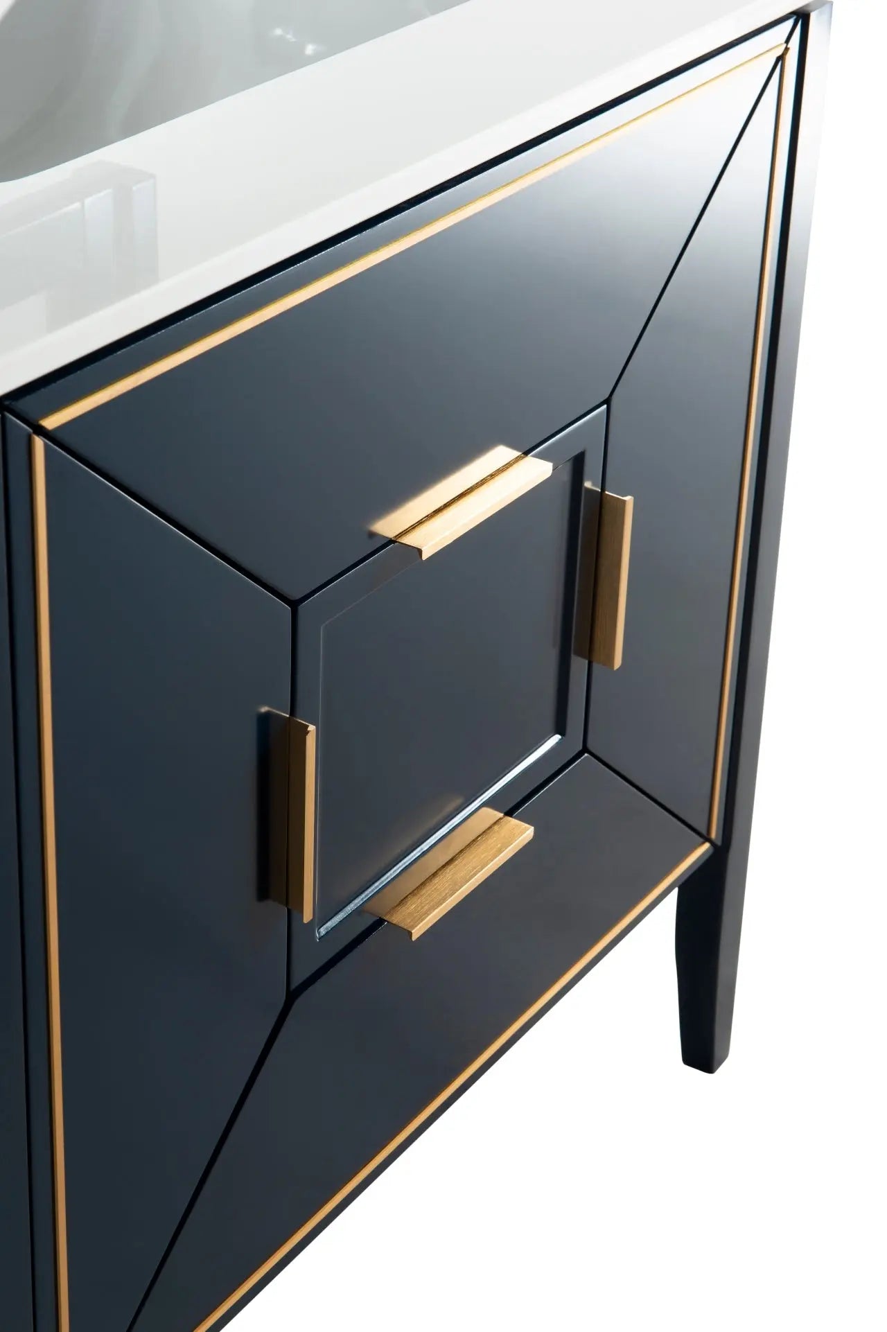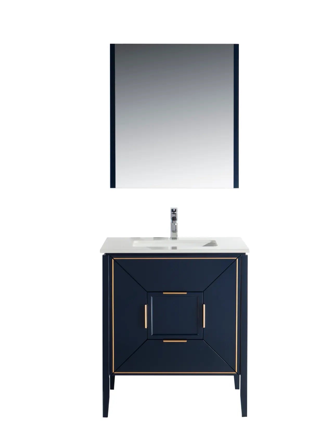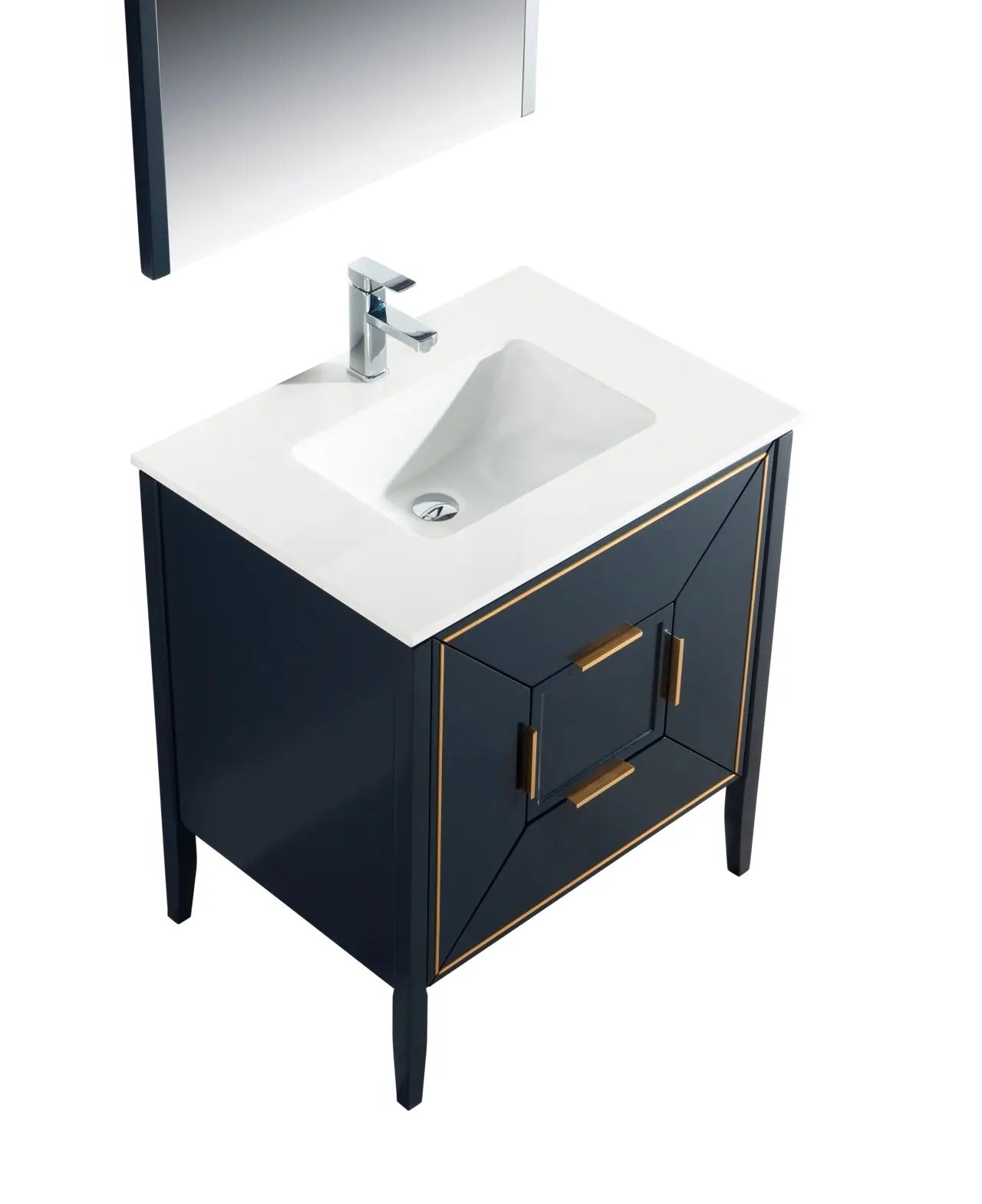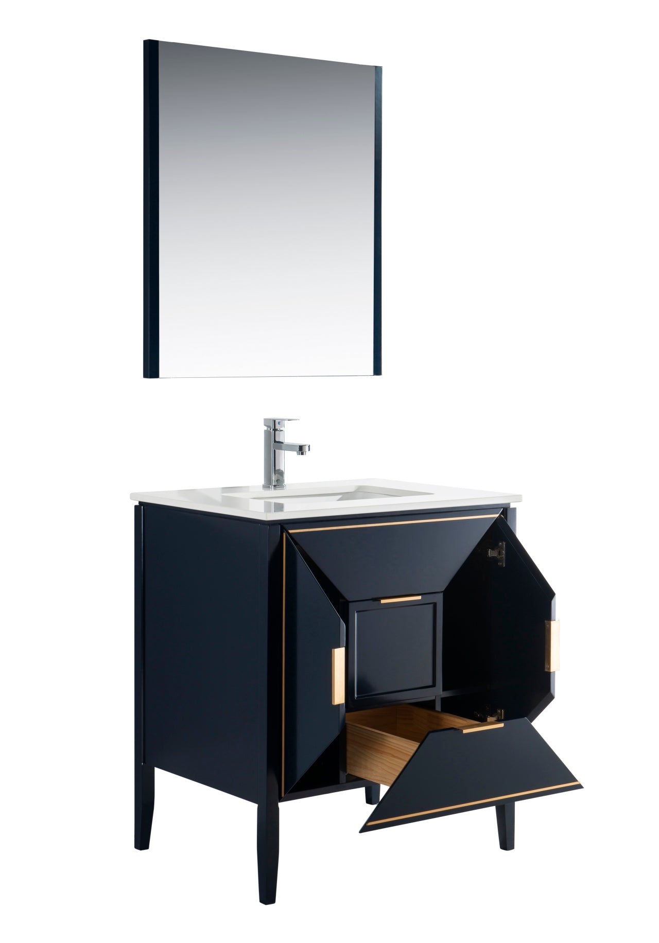 The Vetro 30″ Vanity features two fully functional drawers, two doors and a pure white Quartz countertop with white Ceramic undermount Sink. The cabinet constructed in solid birch, with a rich blue lacquer paint finish, while the inside of the drawers are varnished, with the natural wood color exposed.