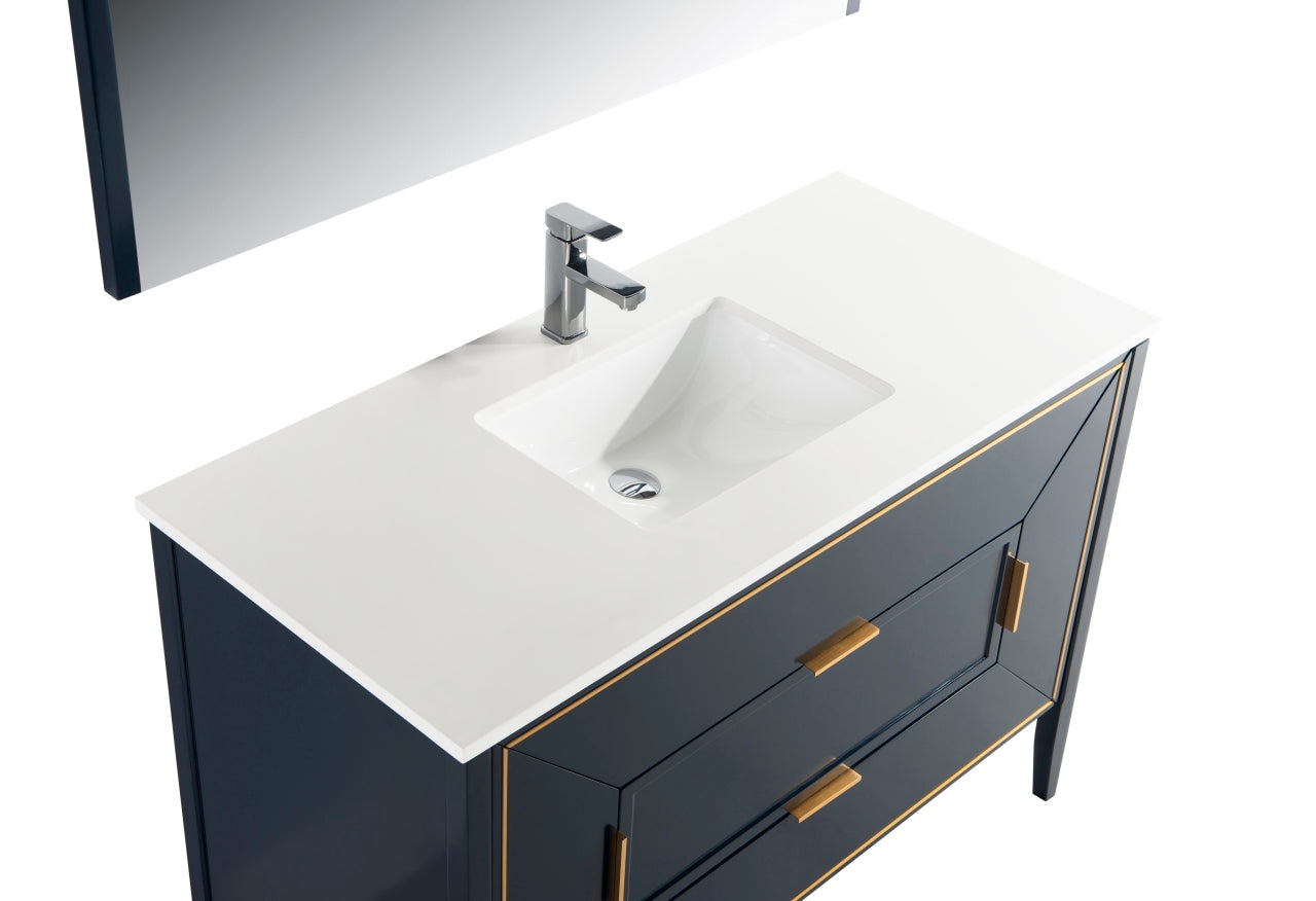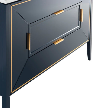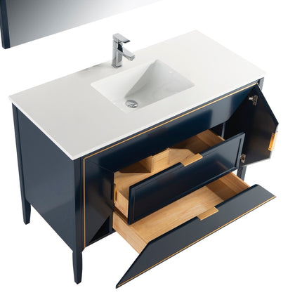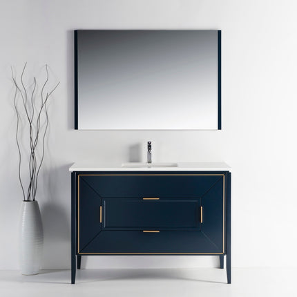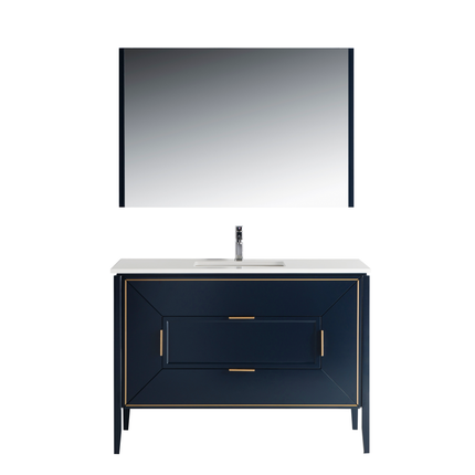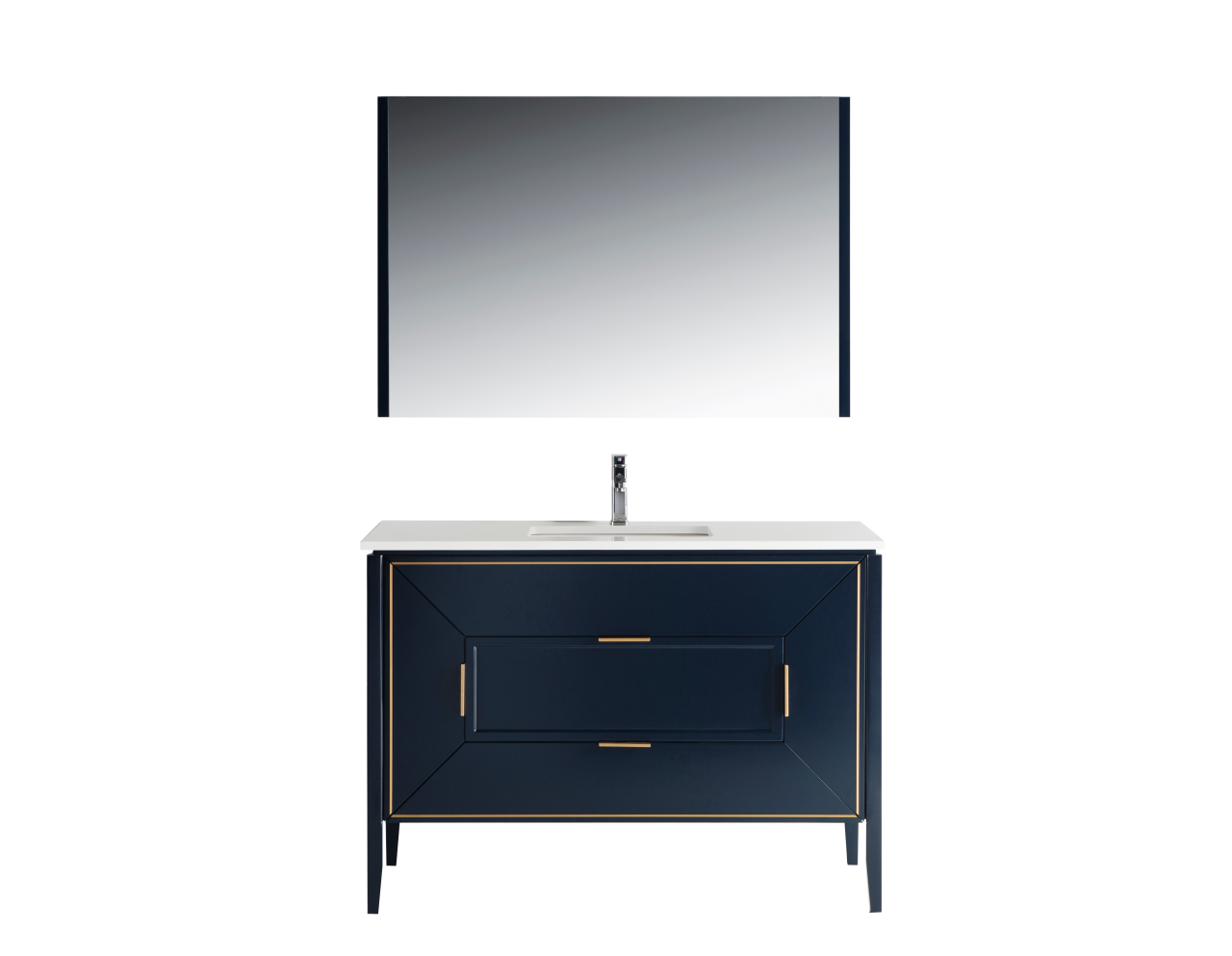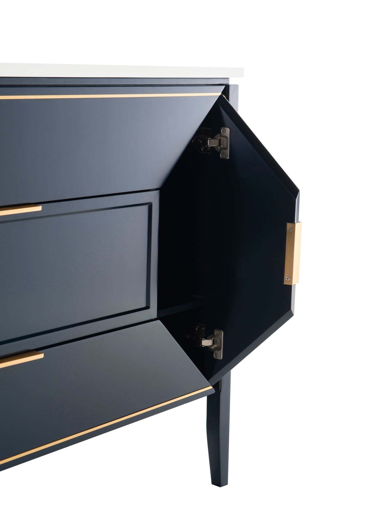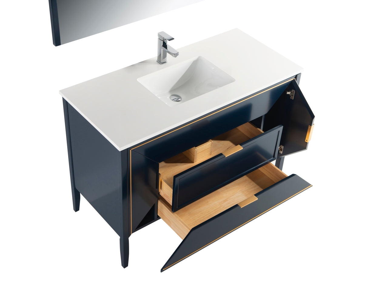 The Vetro 48″ Vanity features two fully functional drawers, two doors and a pure white Quartz countertop with white Ceramic undermount Sink. The cabinet constructed in solid birch, with a rich blue lacquer paint finish, while the inside of the drawers are varnished, with the natural wood color exposed.