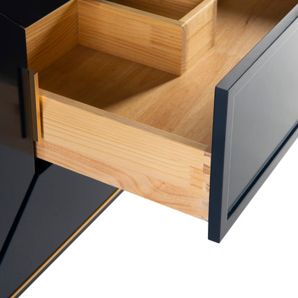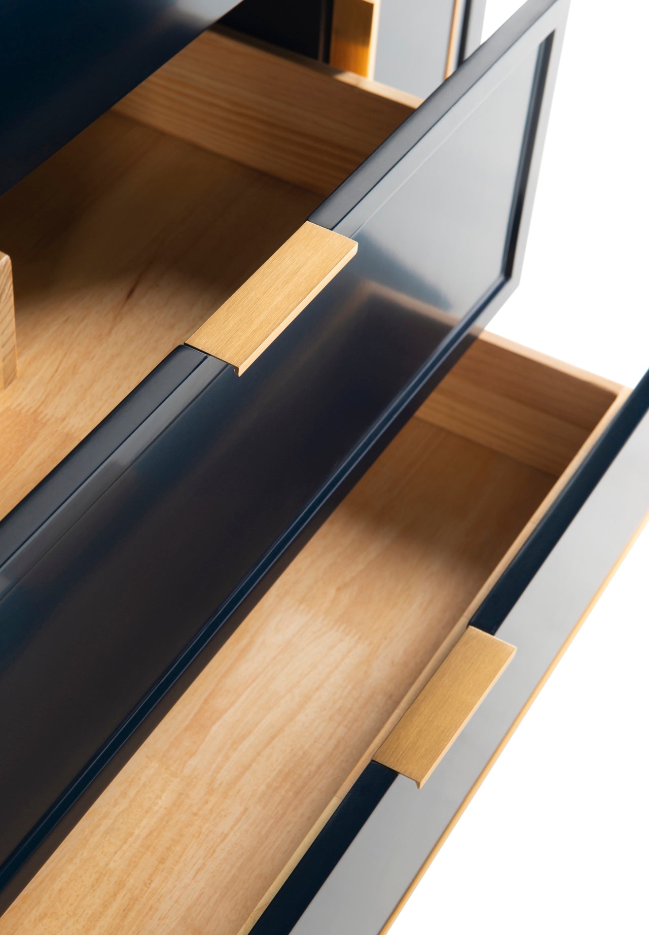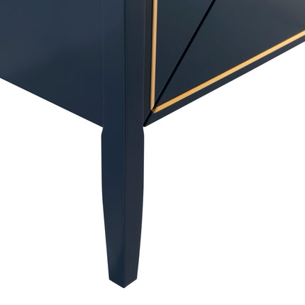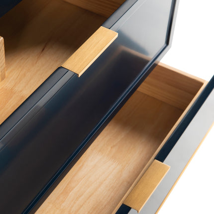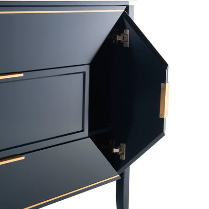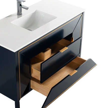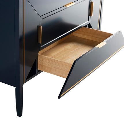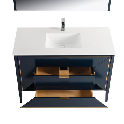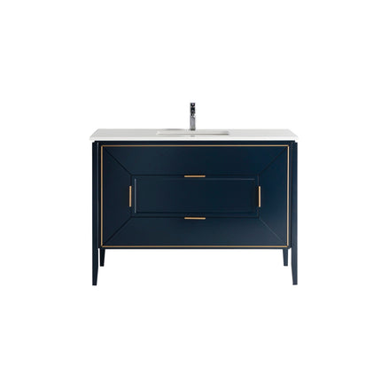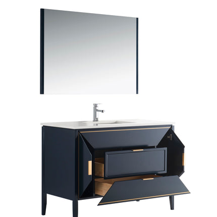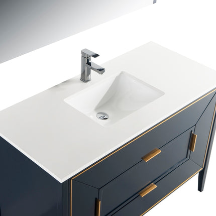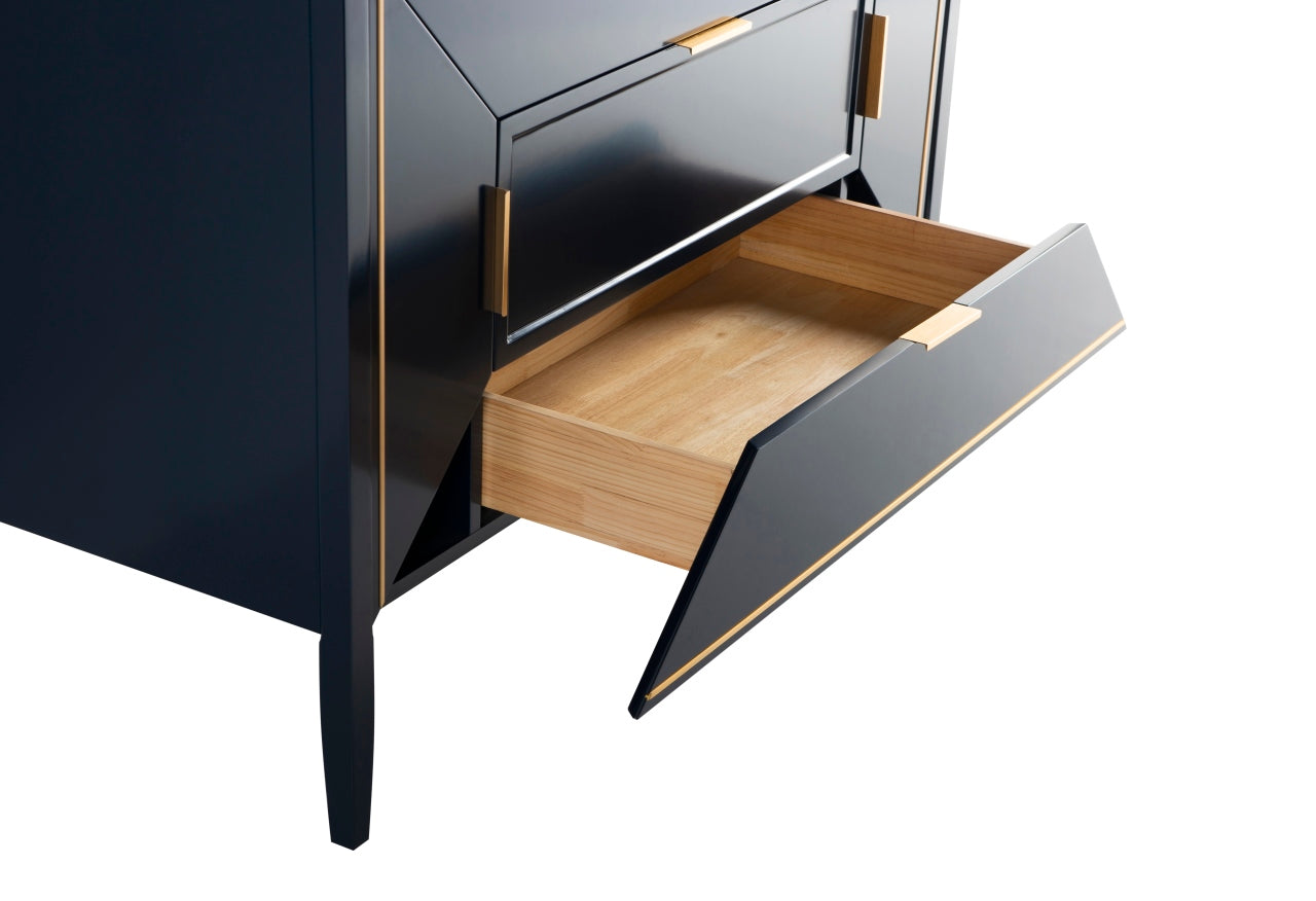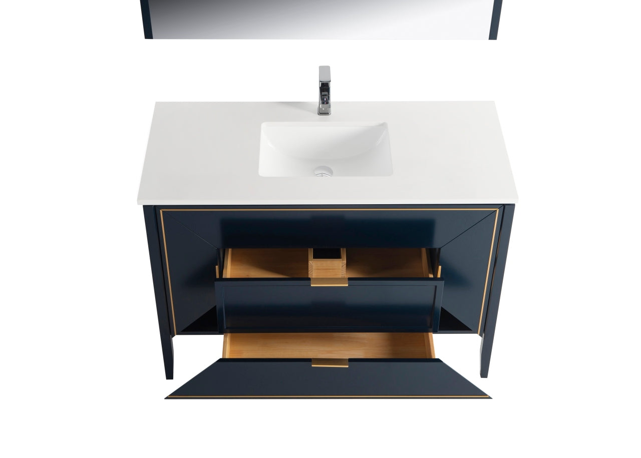 The Vetro 48″ Vanity features two fully functional drawers, two doors and a pure white Quartz countertop with white Ceramic undermount Sink. The cabinet constructed in solid birch, with a rich blue lacquer paint finish, while the inside of the drawers are varnished, with the natural wood color exposed.