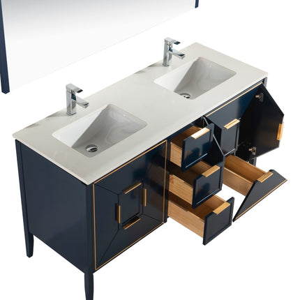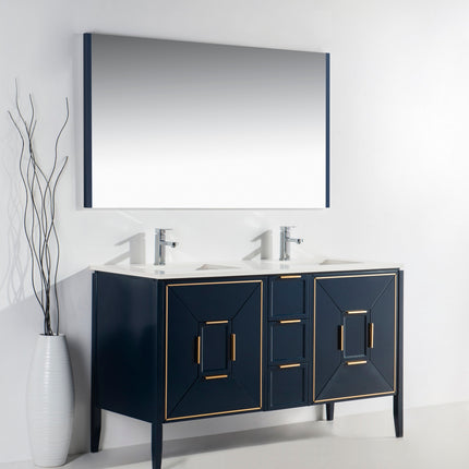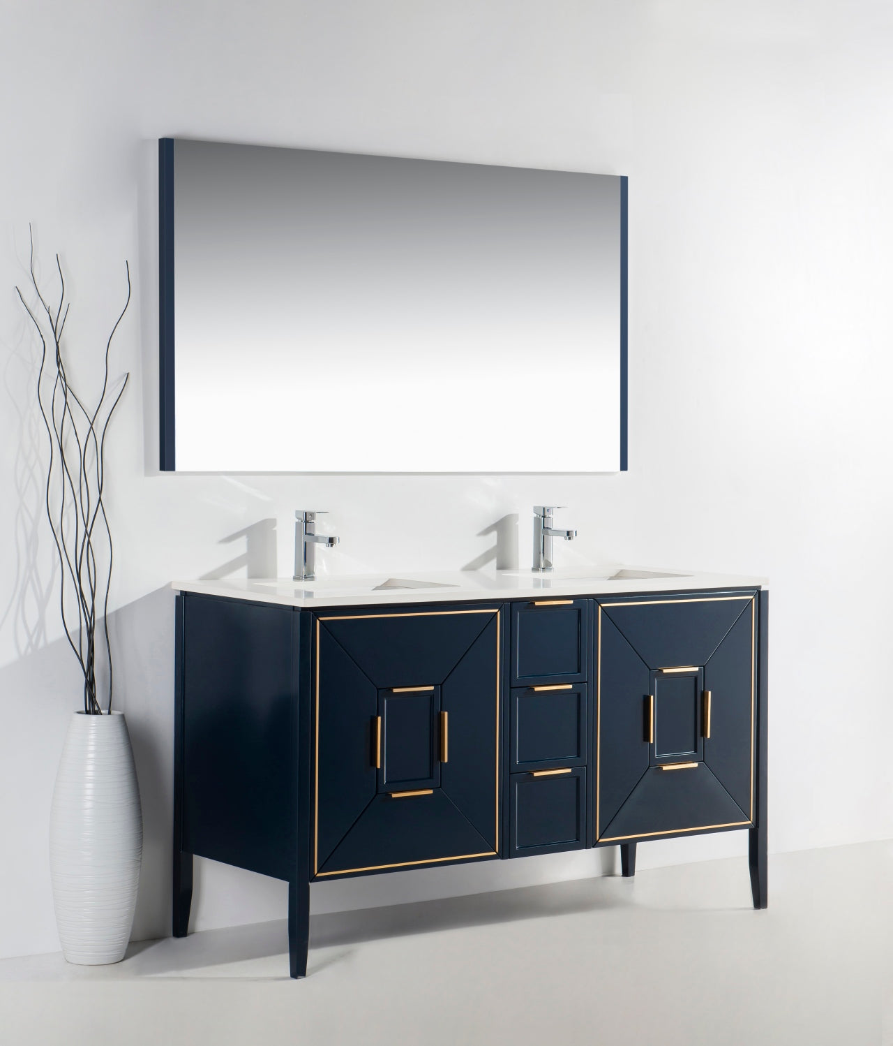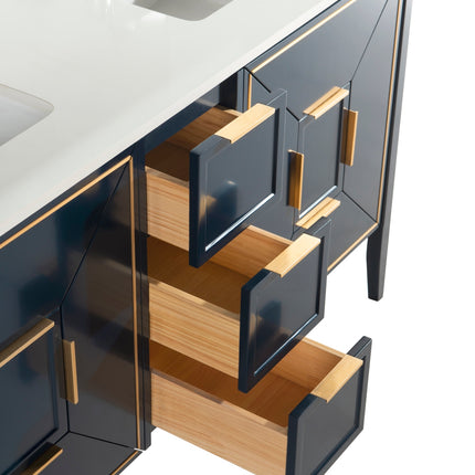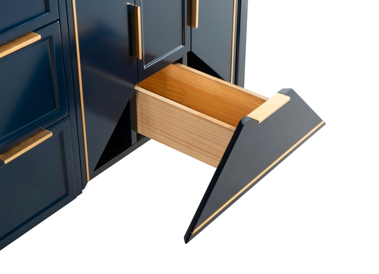 The Vetro 60″ Vanity features five fully functional drawers and six doors, a pure white Quartz countertop with white Ceramic undermount Sink. The cabinet constructed in solid birch, with a rich blue lacquer paint finish, while the inside of the drawers are varnished, with the natural wood color exposed.