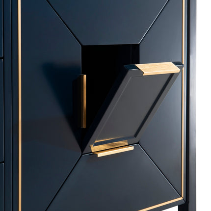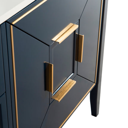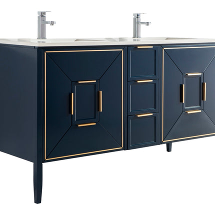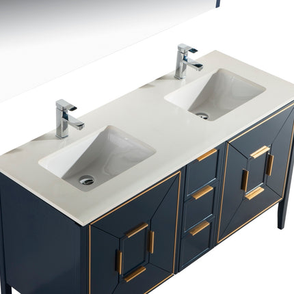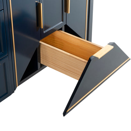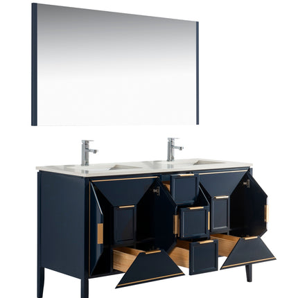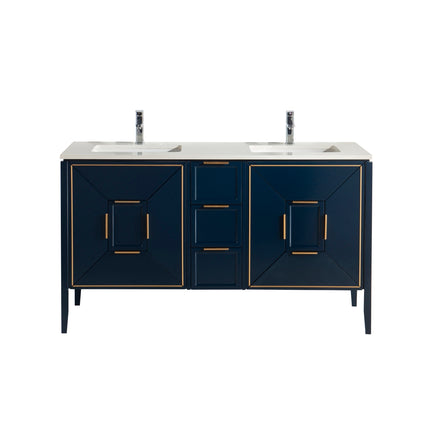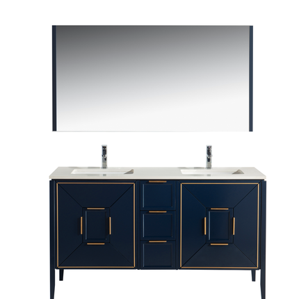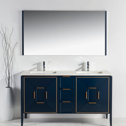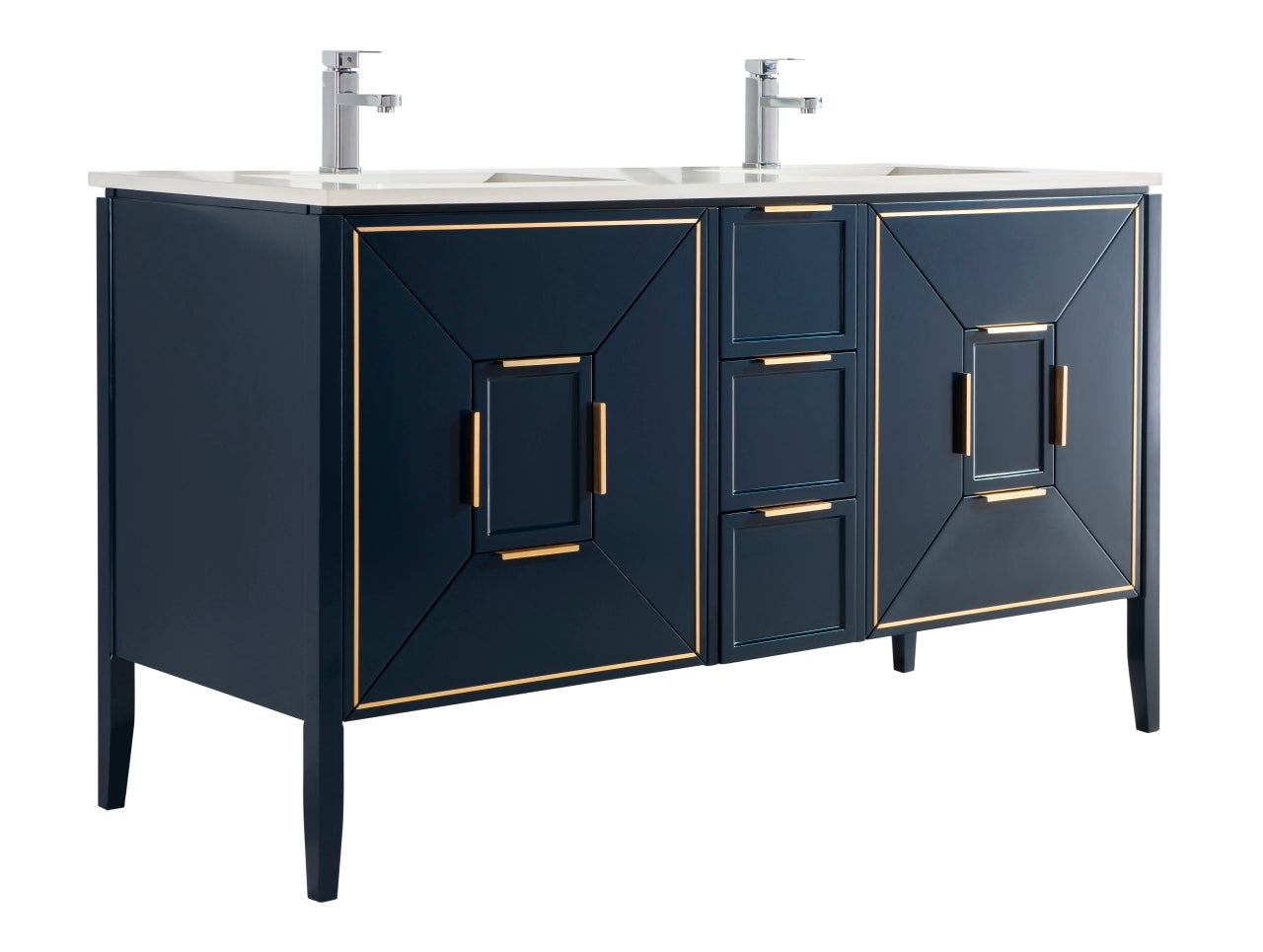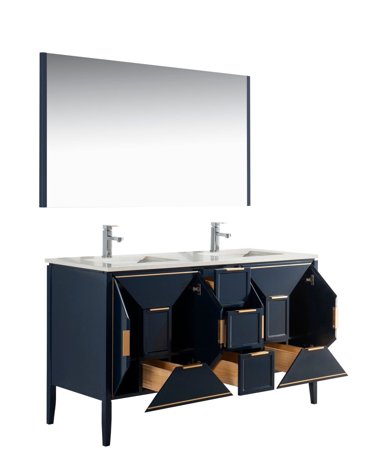 The Vetro 60″ Vanity features five fully functional drawers and six doors, a pure white Quartz countertop with white Ceramic undermount Sink. The cabinet constructed in solid birch, with a rich blue lacquer paint finish, while the inside of the drawers are varnished, with the natural wood color exposed.