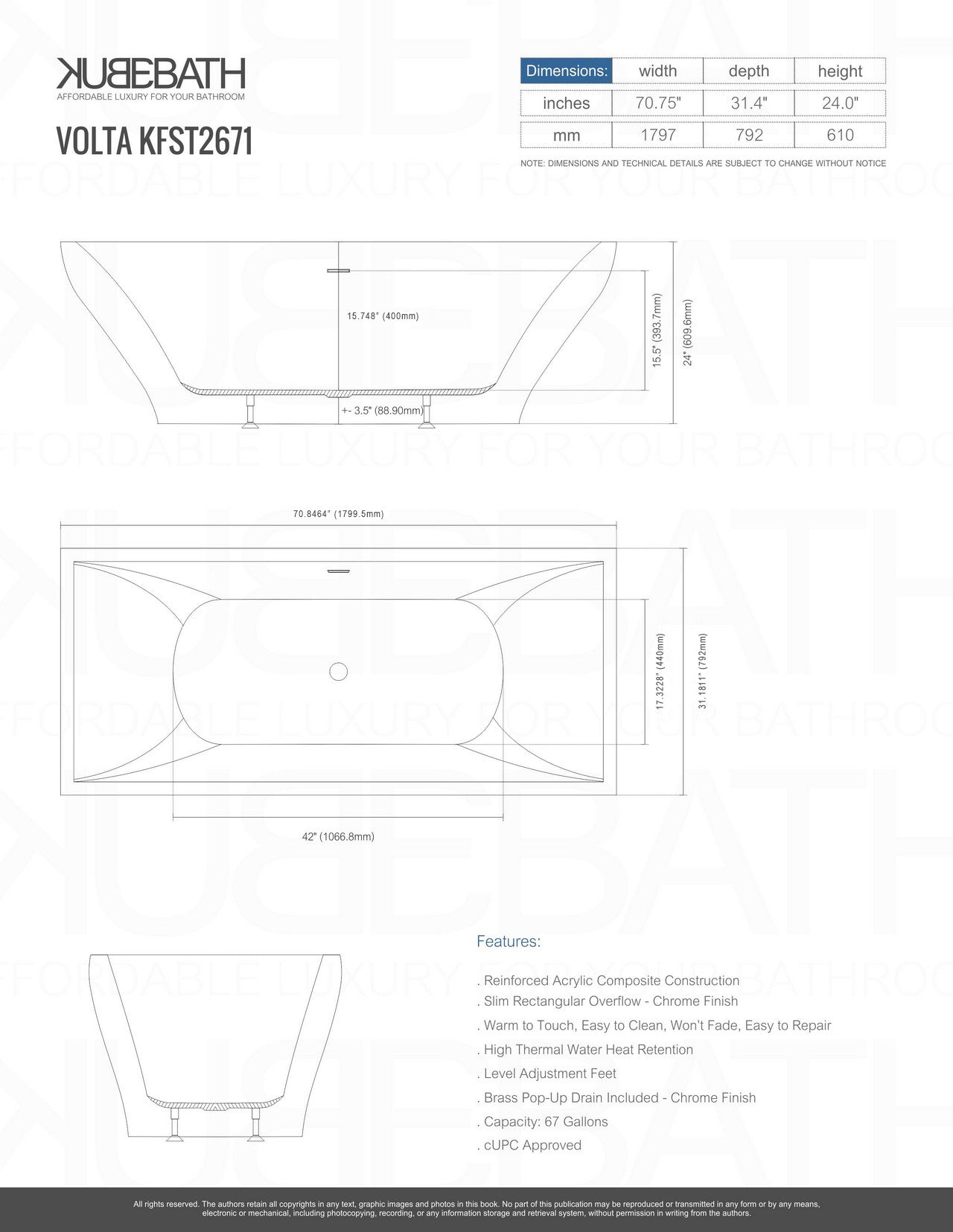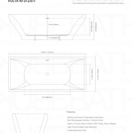 Kube Bath Volta 71 Inch Free Standing Bathtub White