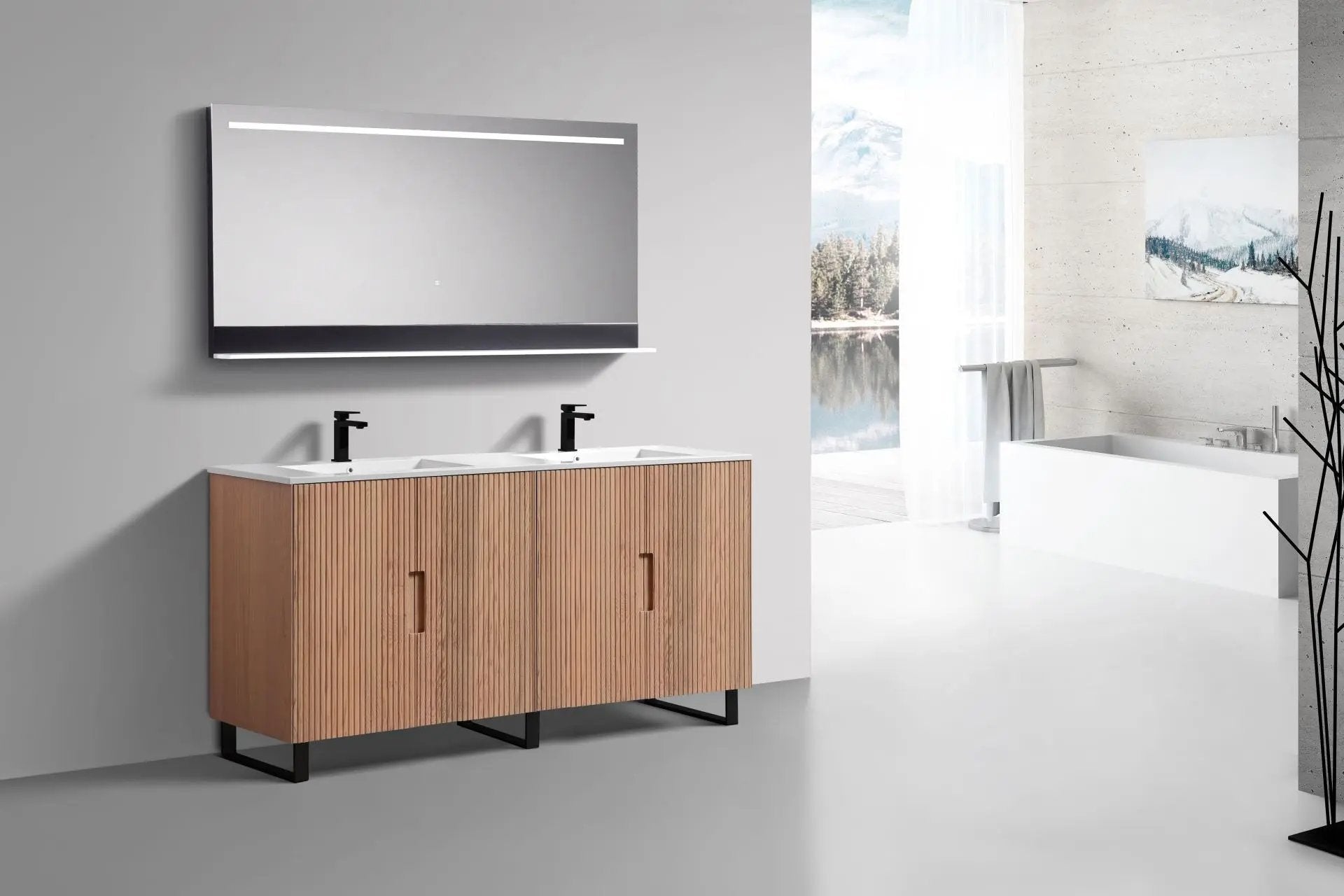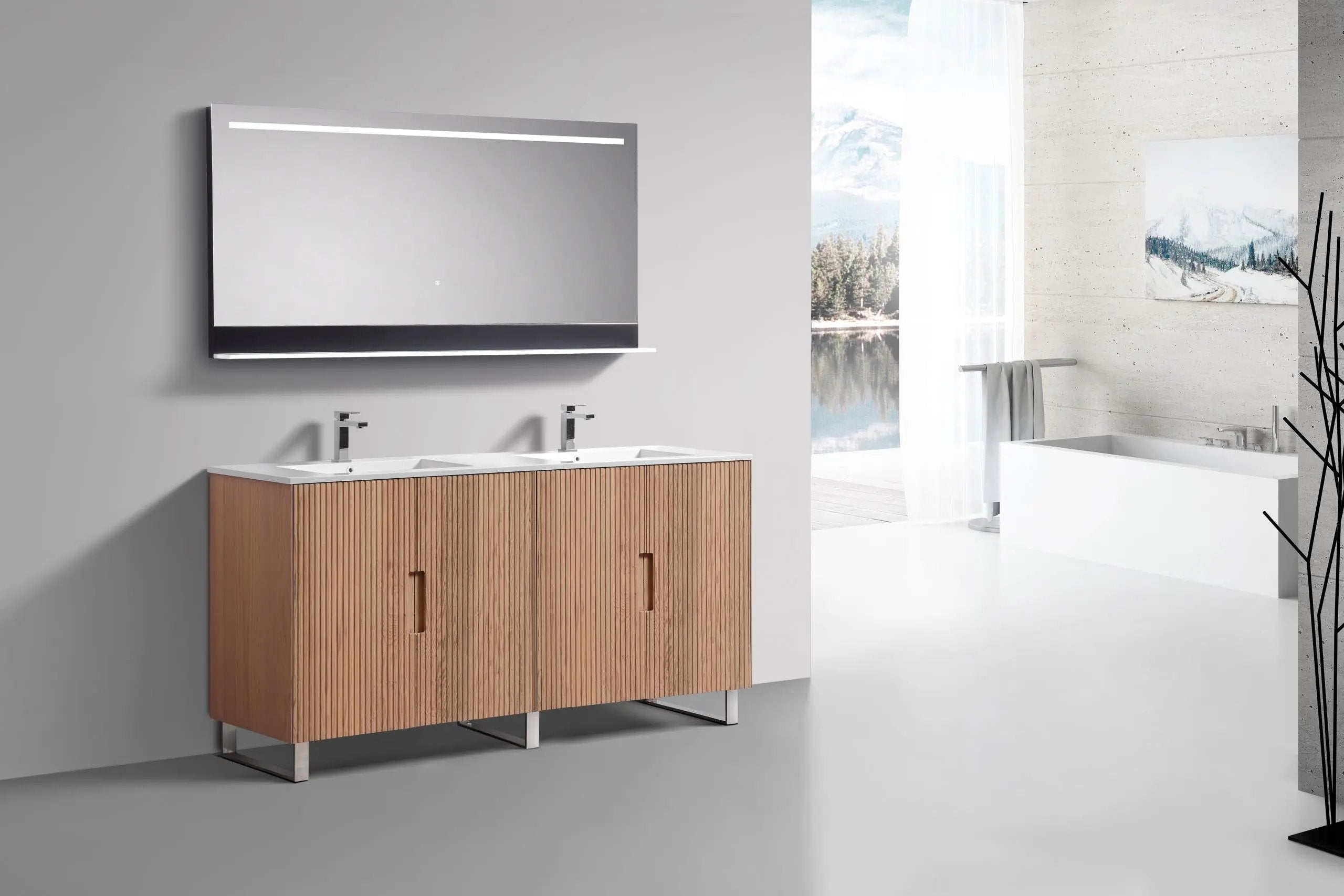 KubeBath FIORE Free Standing Vanity. Boosting a mid-century modern style, the Fiore Vanity features solid wood construction and full extension, soft-closing drawers and doors with plenty of storage. Crafted in Composite Acrylic, the Countertop features a rectangular sleek integrated Sink(s), making it easy to clean. Clean lines and crisp design align for an edgy style designed to meet your needs.