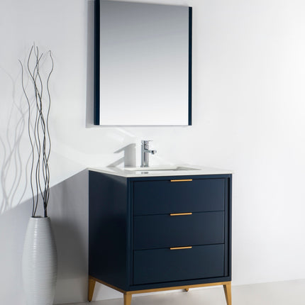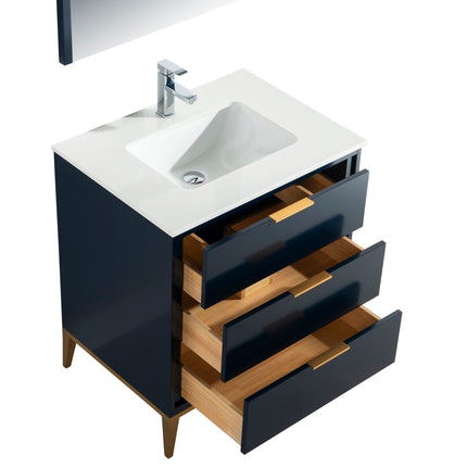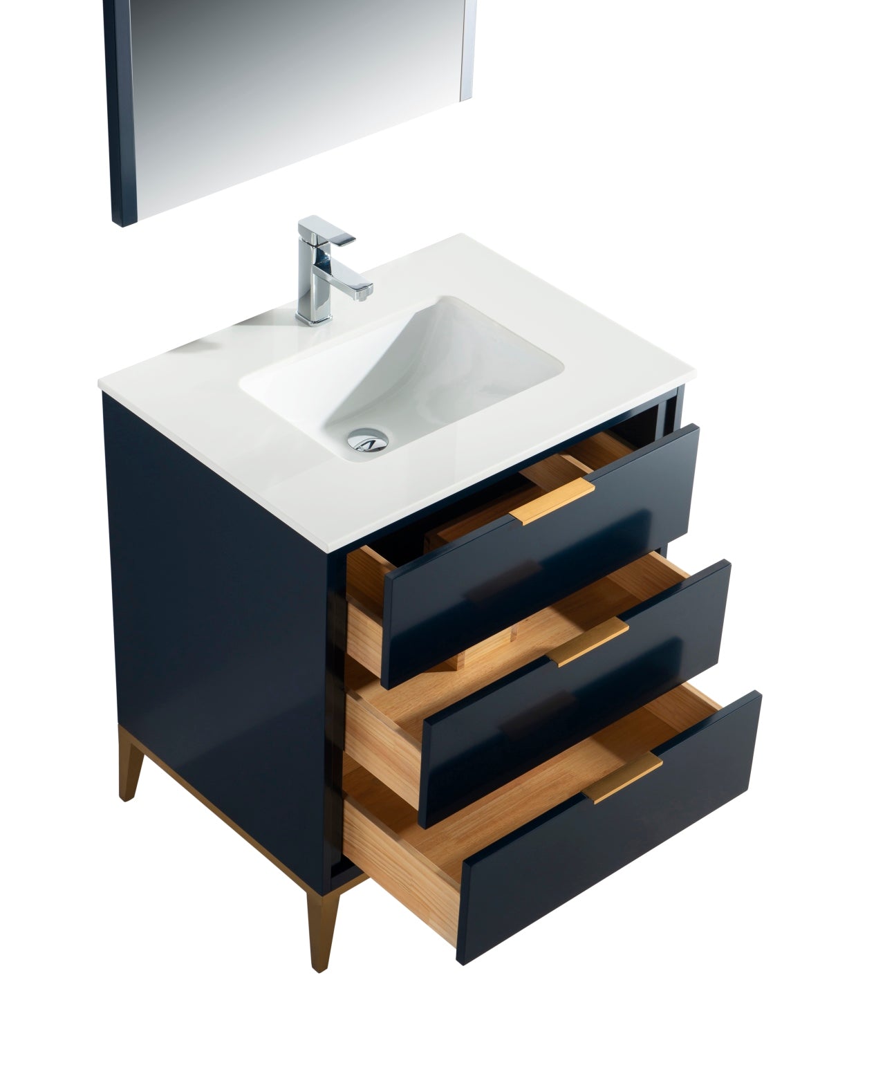 The Divani 30″ Vanity features three fully functional drawers, a pure white Quartz countertop with white Ceramic undermount Sink.