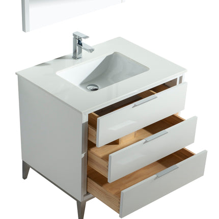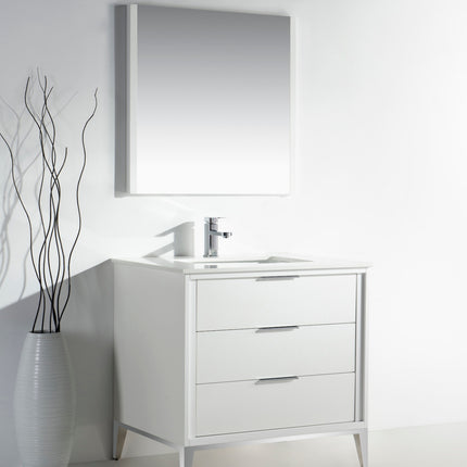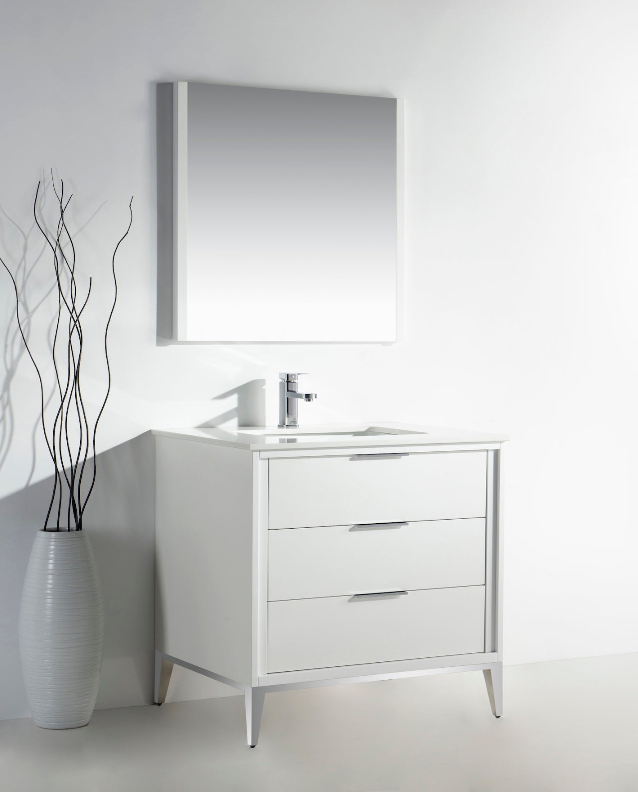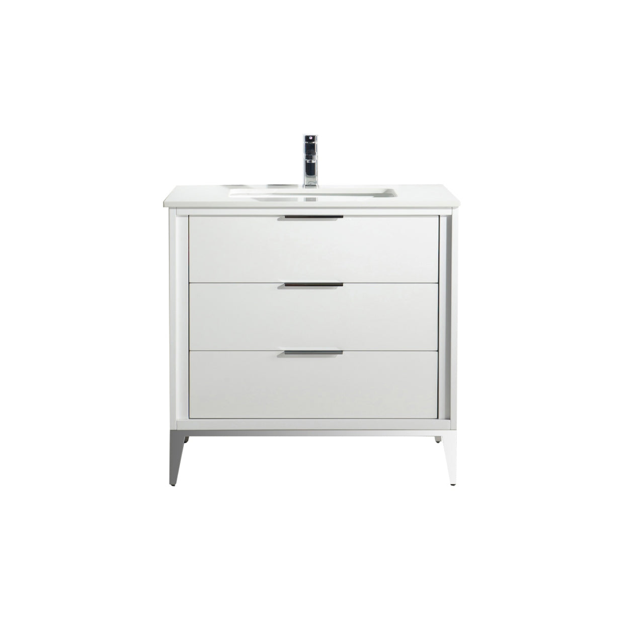 The Divani 36″ Vanity features three fully functional drawers and a pure white Quartz countertop with white Ceramic undermount Sink. The cabinet constructed in solid birch, with a rich white lacquer paint finish, while the inside of the drawers are varnished, with the natural wood color exposed.