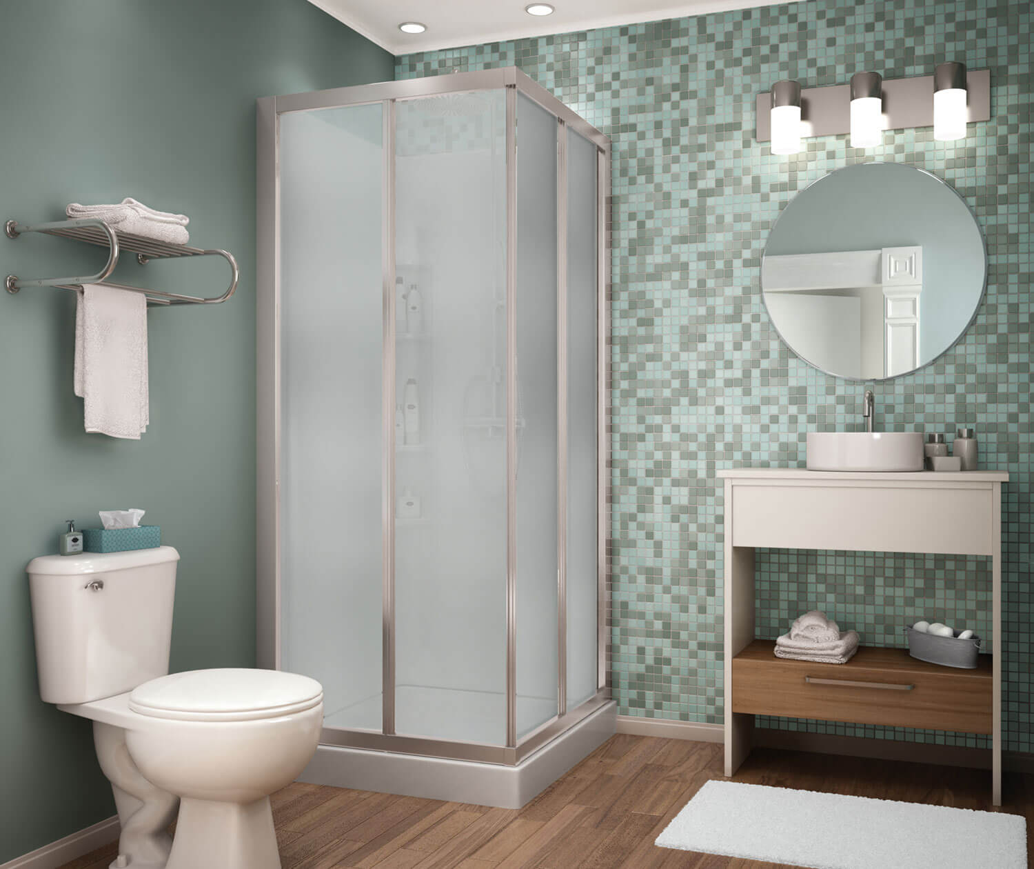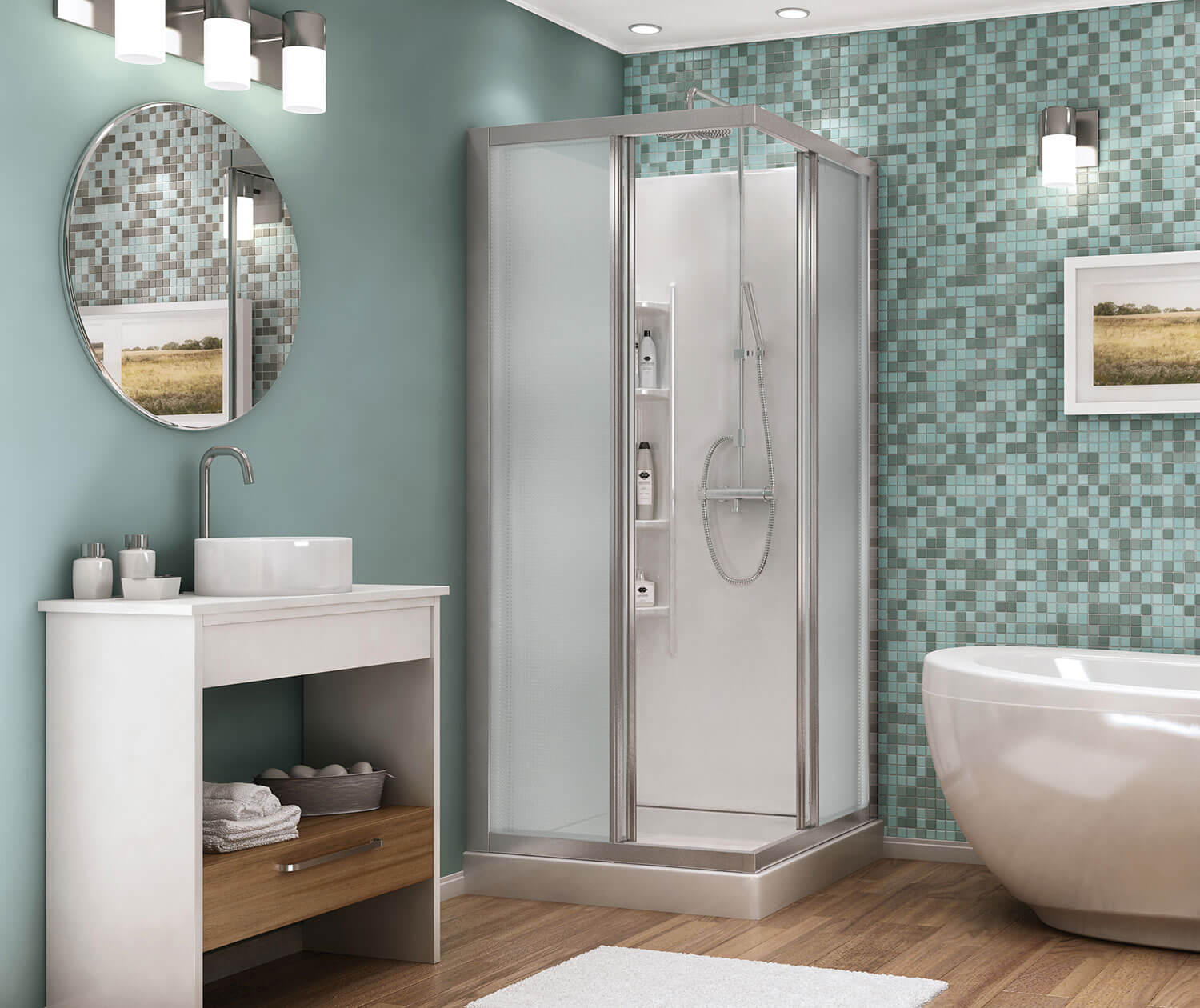 Maax 32 Mediterranean III 32 x 32 Polystyrene Center Drain Shower Kit in White with Mistelite glass in Chrome 105605-000-129-104