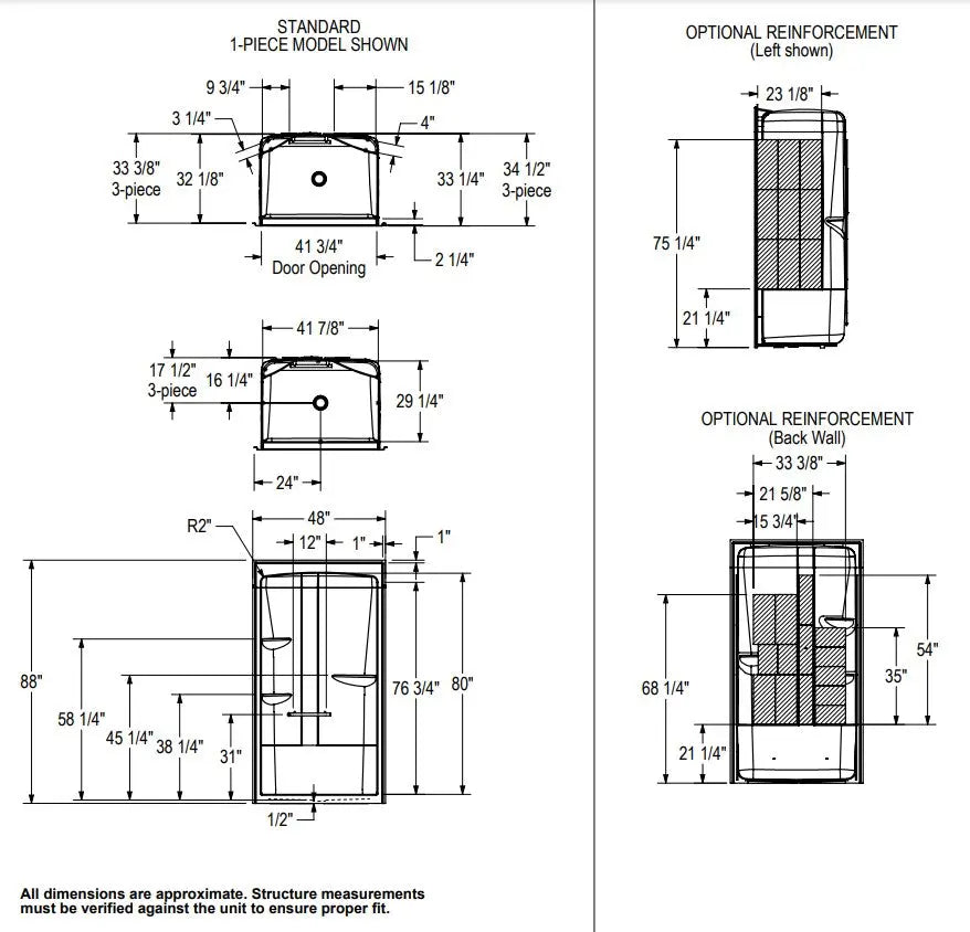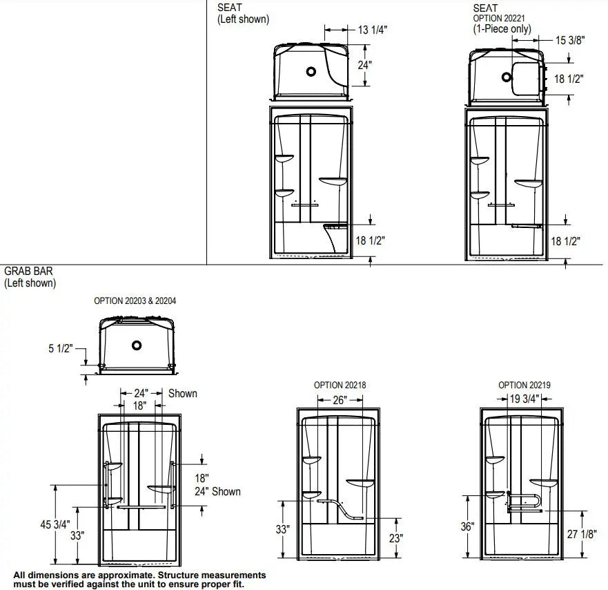 • Optional grab bars available (grab bar installed on back wall replaces standard bar)