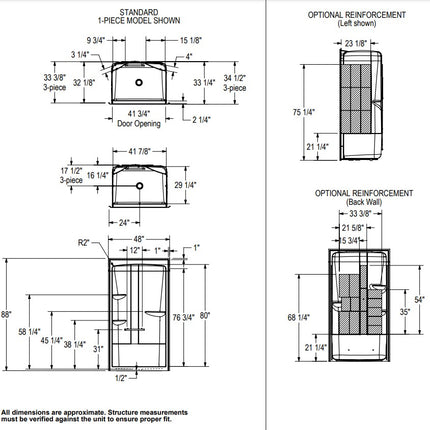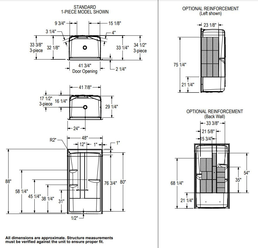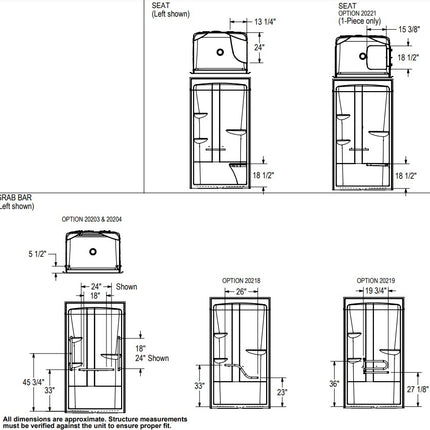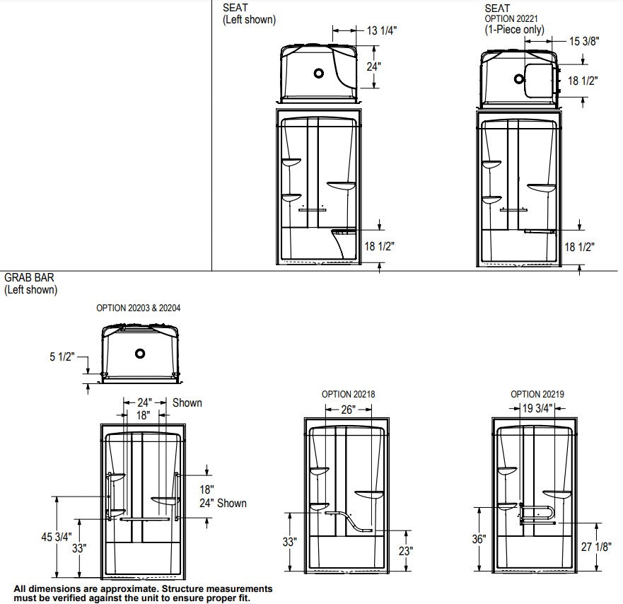 - Optional grab bars available (grab bar installed on back wall replaces standard bar)