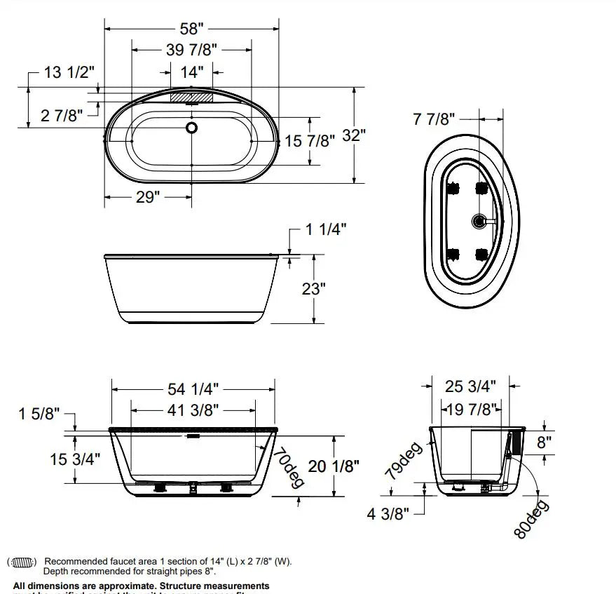 Eldora 5832 AcrylX Freestanding Center Drain Bathtub in White with White Skirt