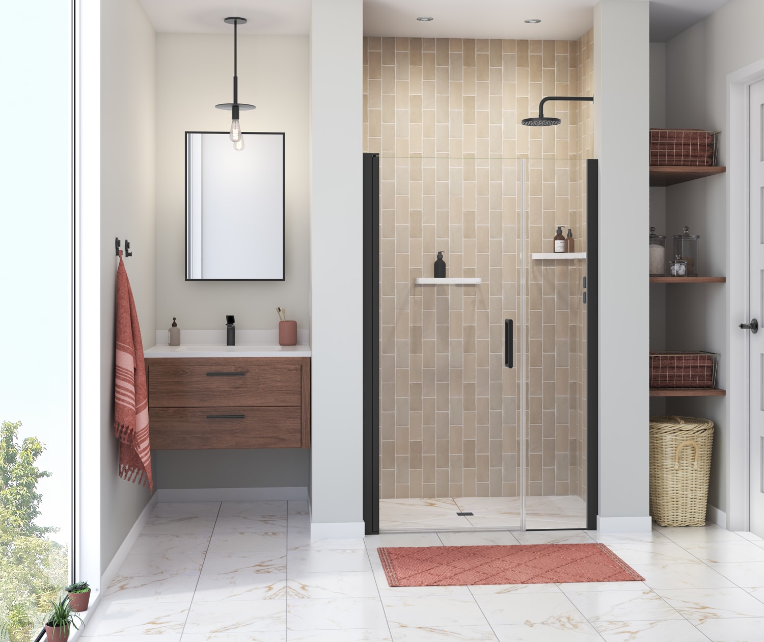 Manhattan 43-45 x 68 in. 6 mm Pivot Shower Door for Alcove Installation with Clear glass & Round Handle in Matte Black