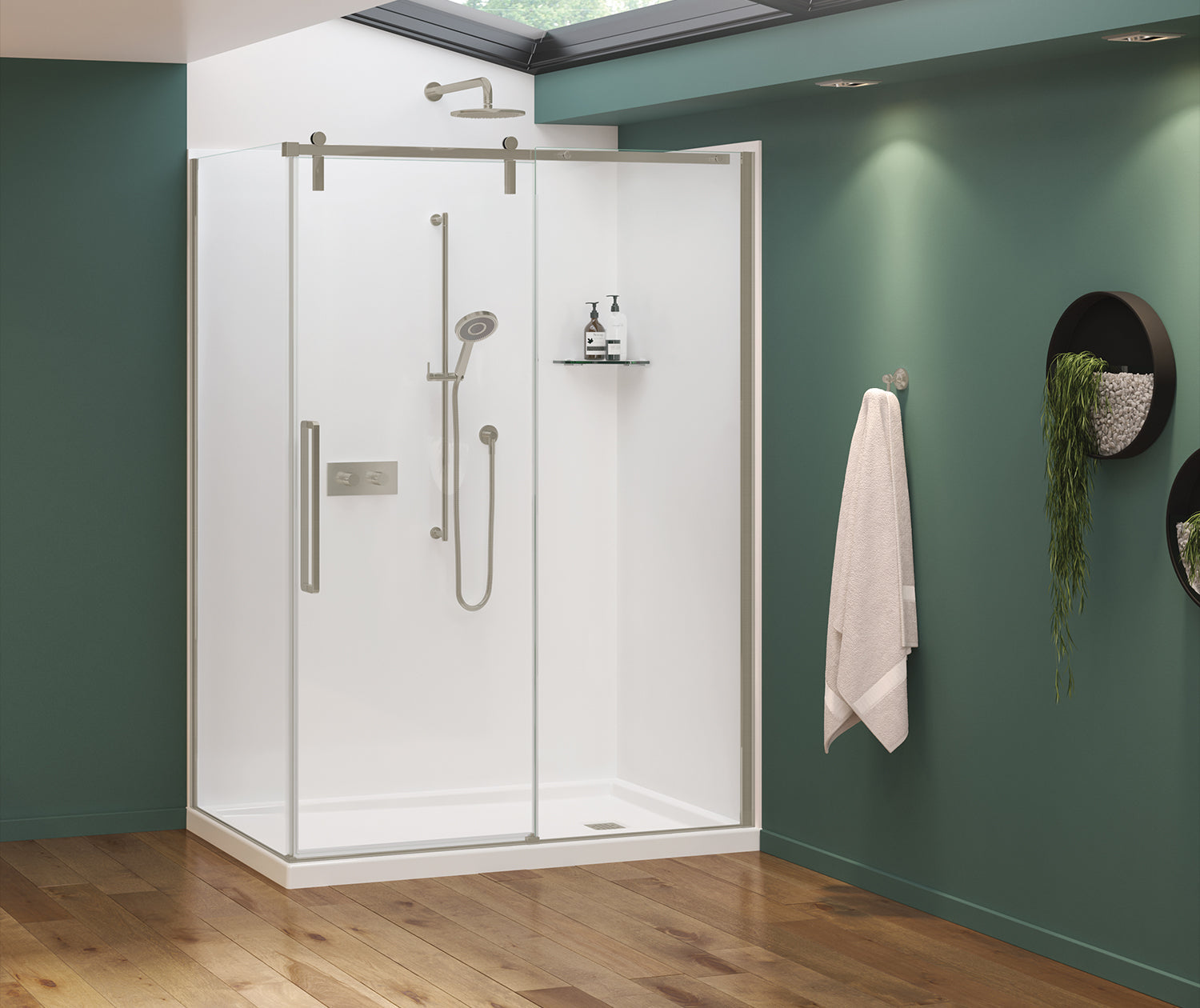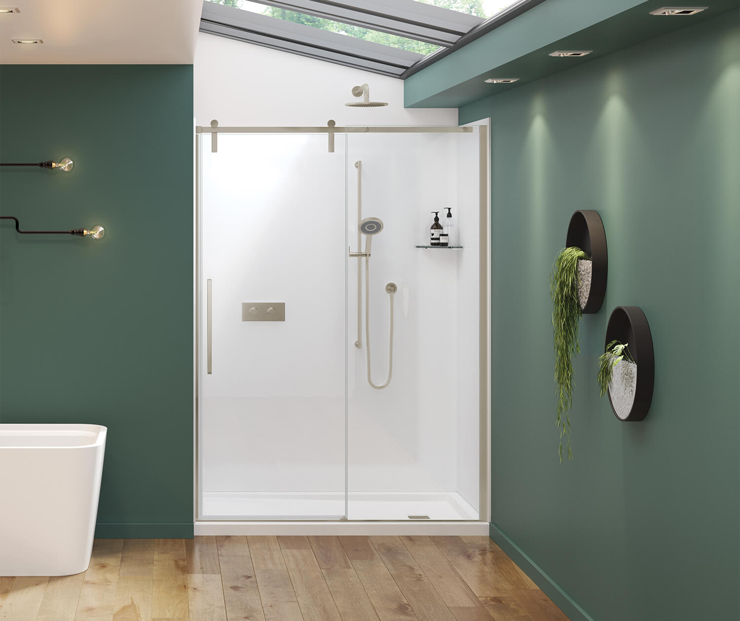 Nebula 56 ½-58 ½ x 78 ¾ in. 8mm Sliding Shower Door for Alcove Installation with Clear glass in Brushed Nickel - Plumbing Market