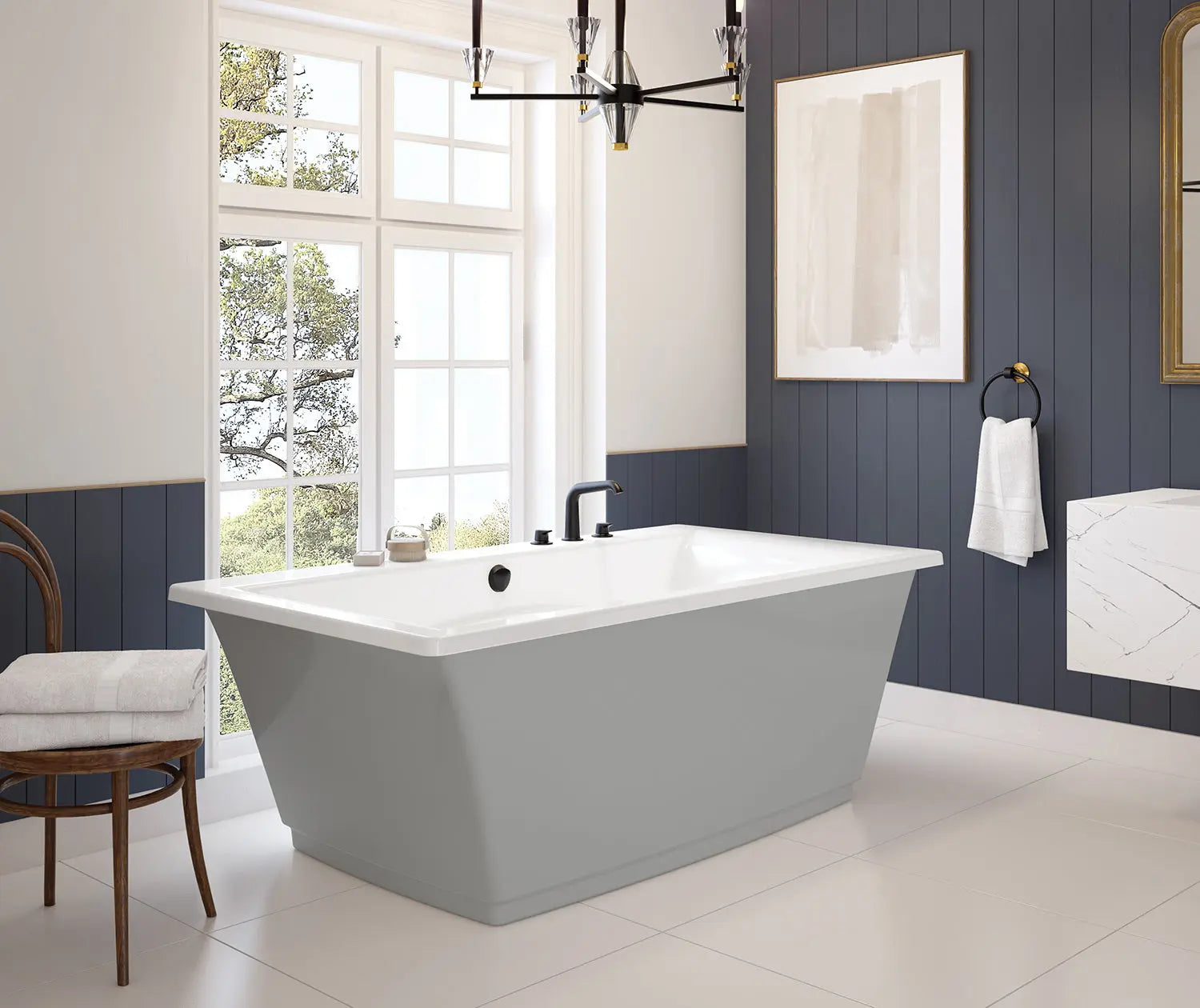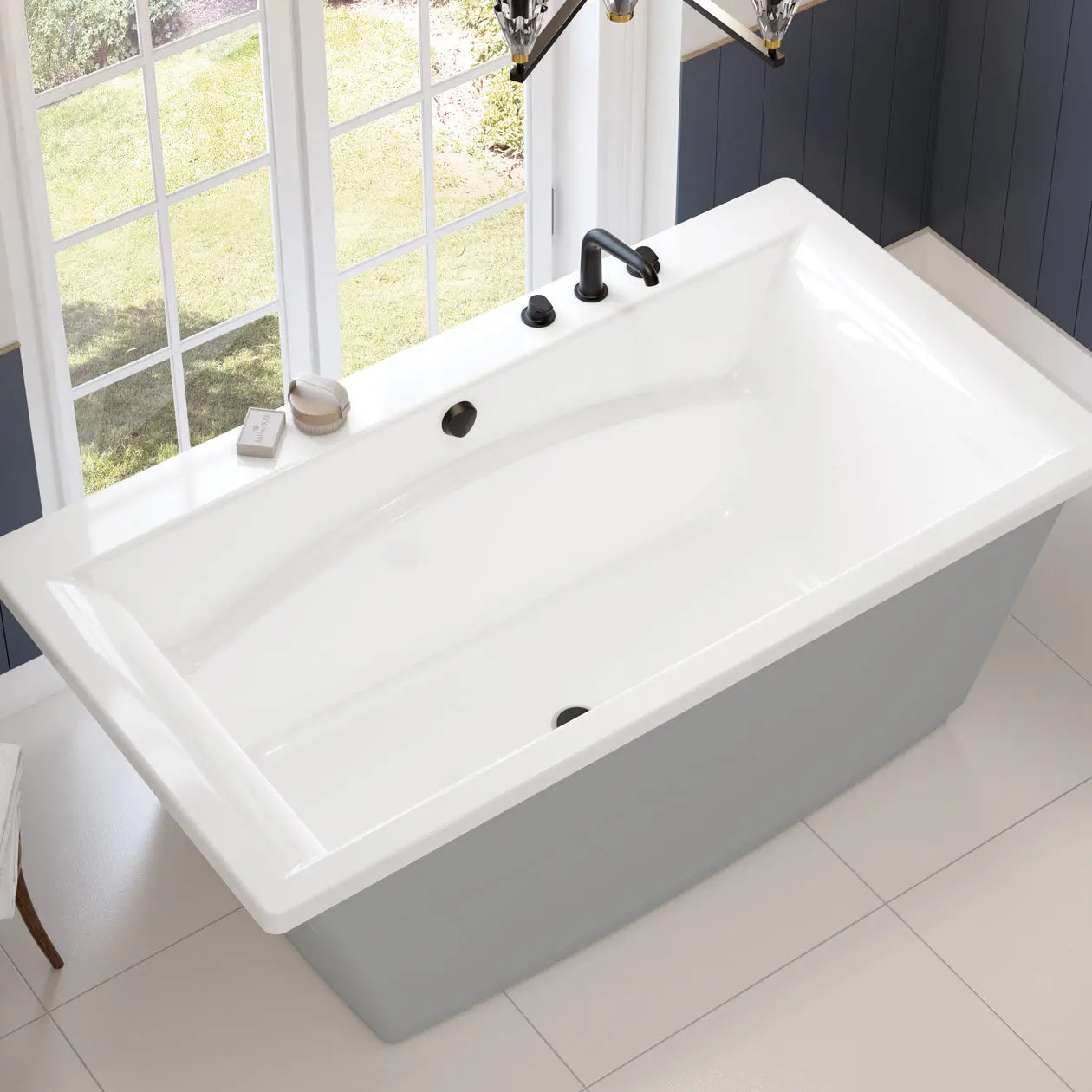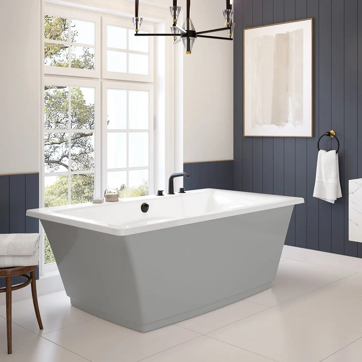 Optik 6636 F Acrylic Freestanding Center Drain Bathtub in White with Sterling Silver Skirt
