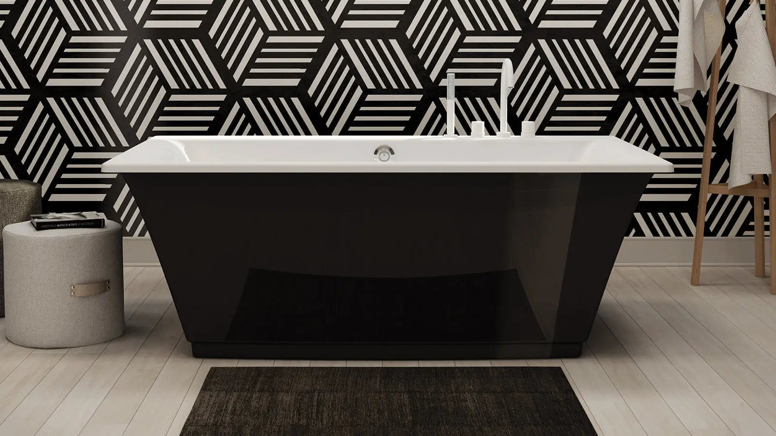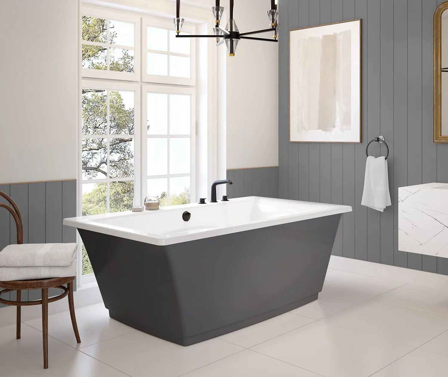 Optik 6636 F Acrylic Freestanding Center Drain Bathtub in White with Thunder Grey Skirt