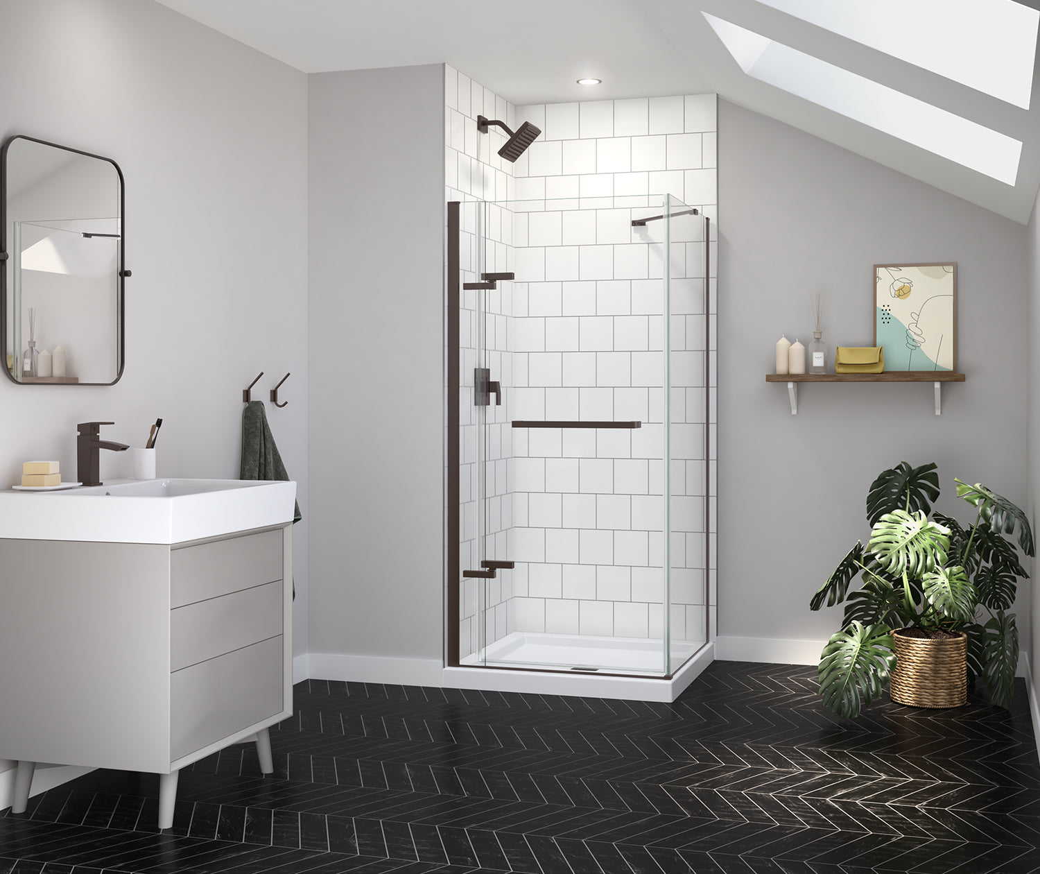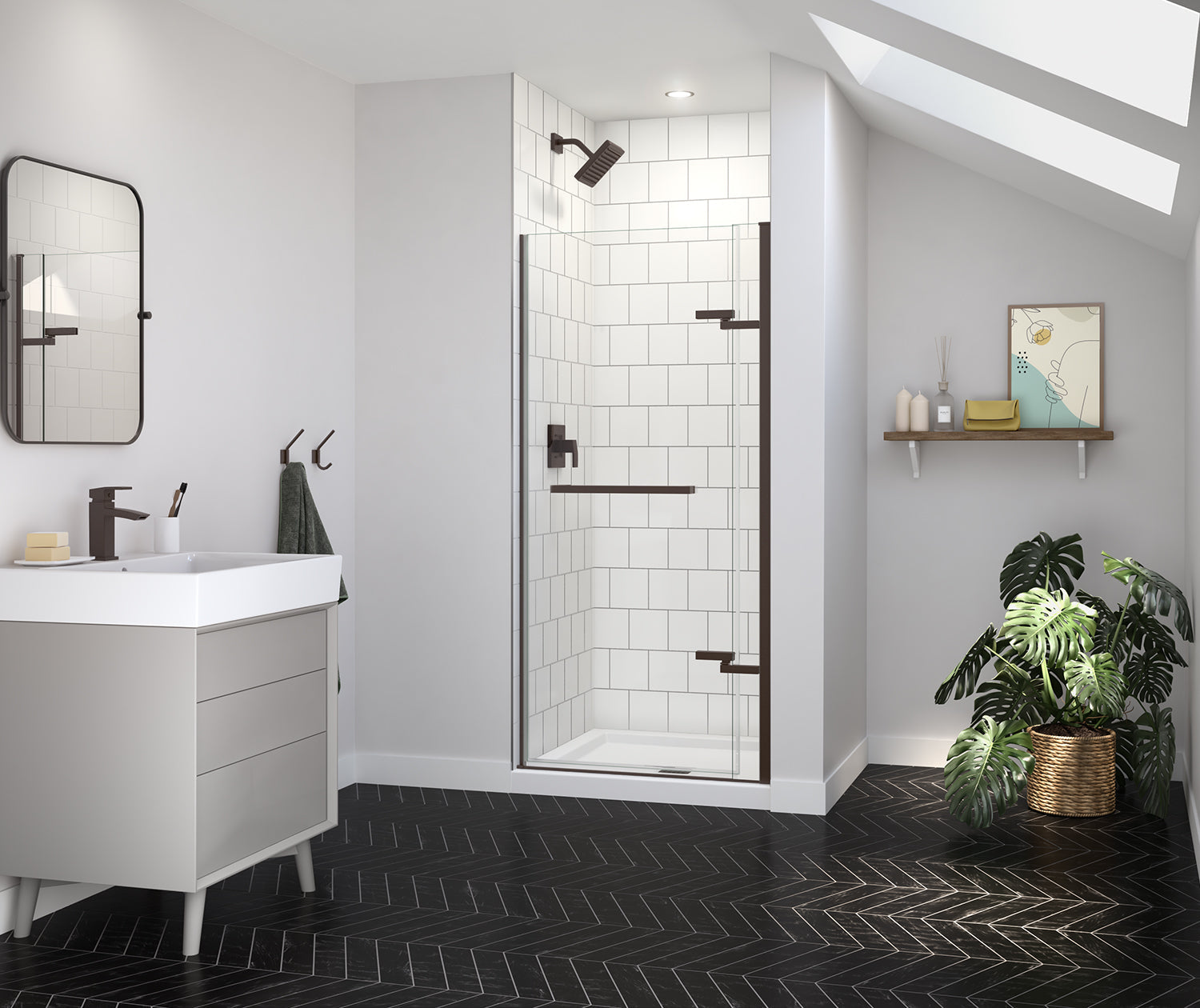 Reveal Sleek 71 32 1/2-35 1/2 x 71 1/2 in. 8mm Pivot Shower Door for Alcove Installation with Clear glass in Dark Bronze