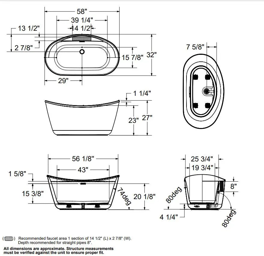 Sonoma 58 x 32 AcrylX Freestanding Center Drain Bathtub in White with White Skirt