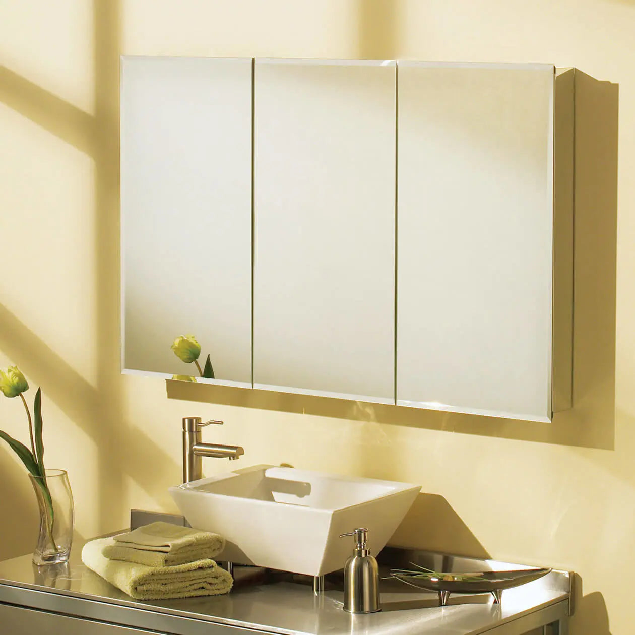 • This MAAX ELEMENT medicine cabinet has a 48-inch width by 31-inch height with a 5-inch depth, has three pivoting panels and a classic 1/2-inch beveled edge and polished chrome base.