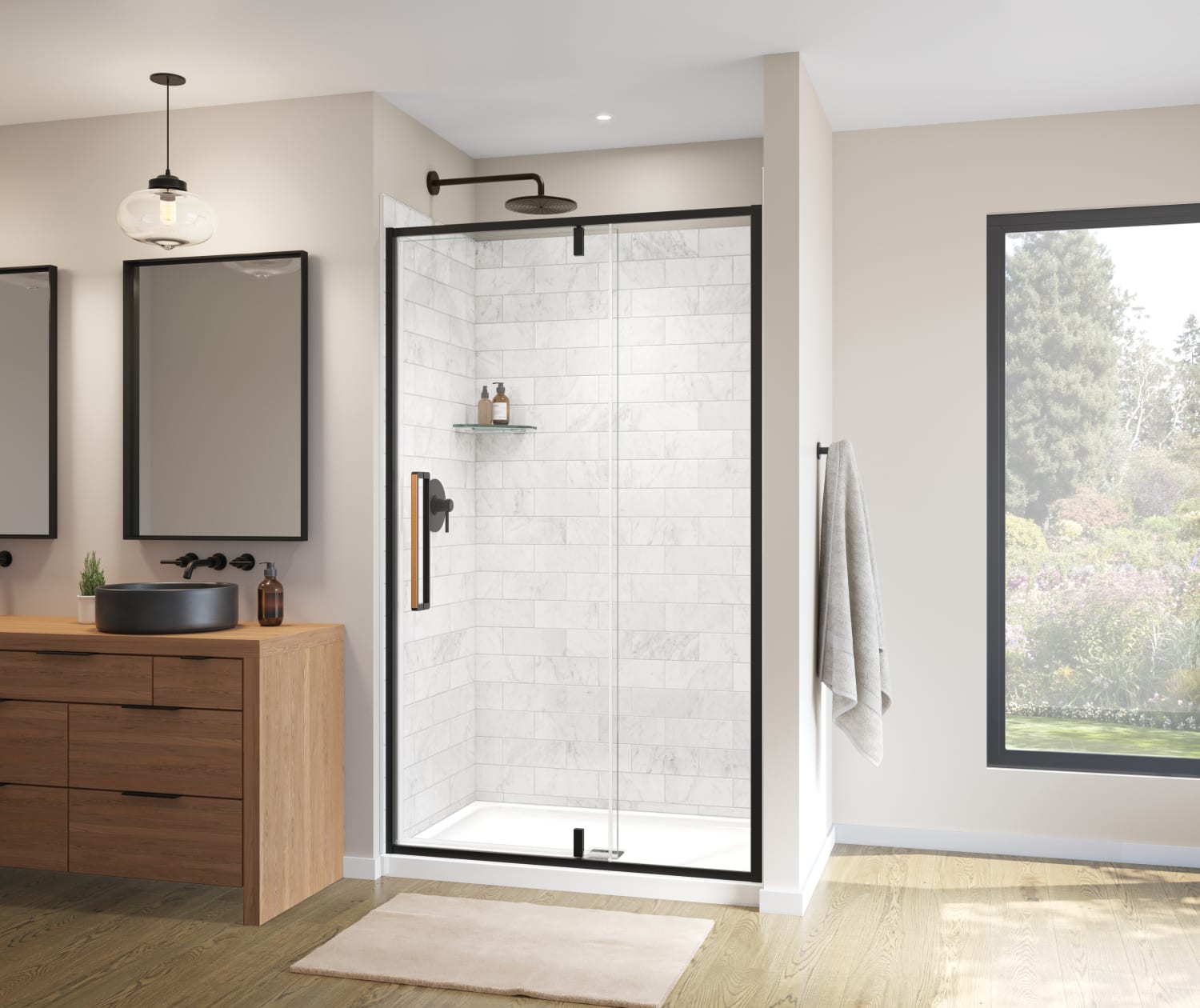 Uptown 45-47 x 76 in. 8 mm Pivot Shower Door for Alcove Installation with Clear glass in Matte Black & Wood