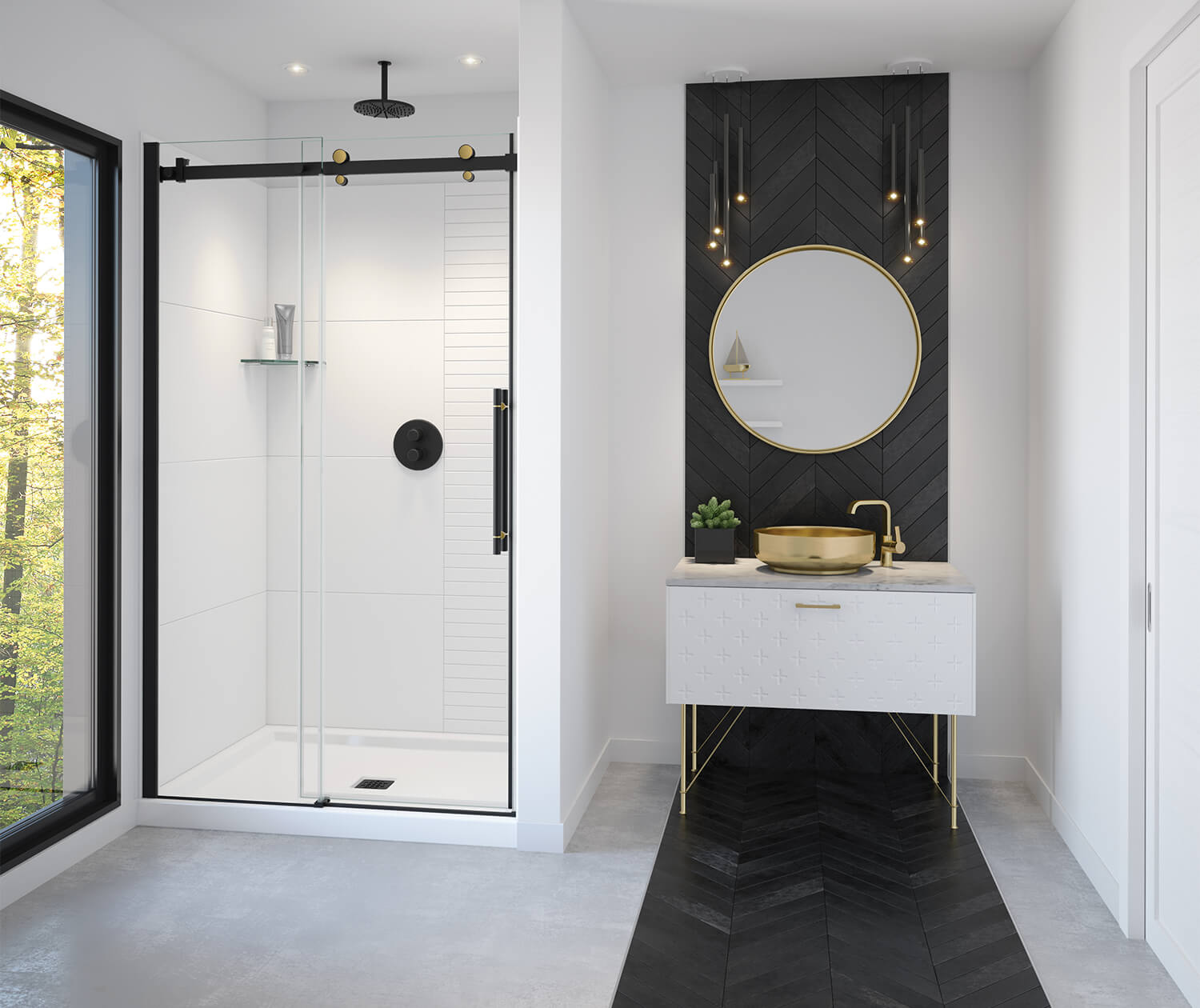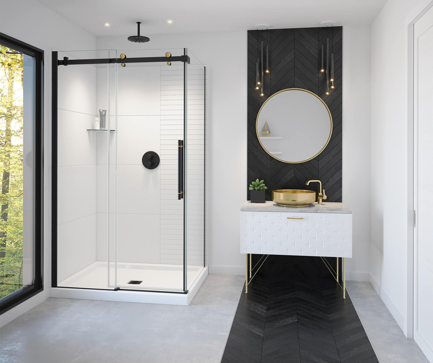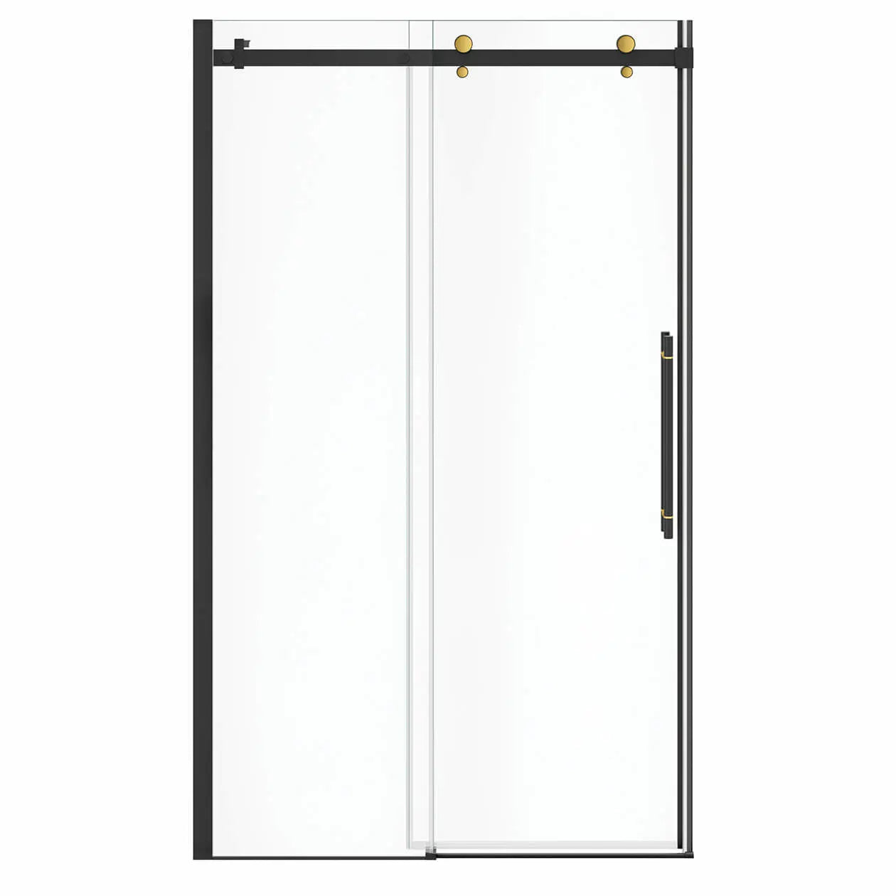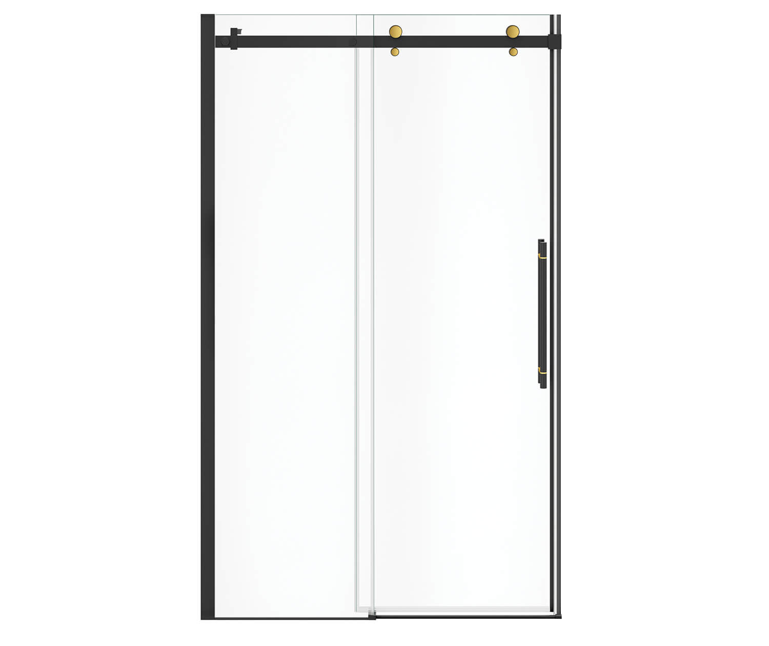 Vela 44 ½-47 x 78 ¾ in. 8mm Sliding Shower Door for Alcove Installation with Clear glass in Matte Black and Brushed Gold